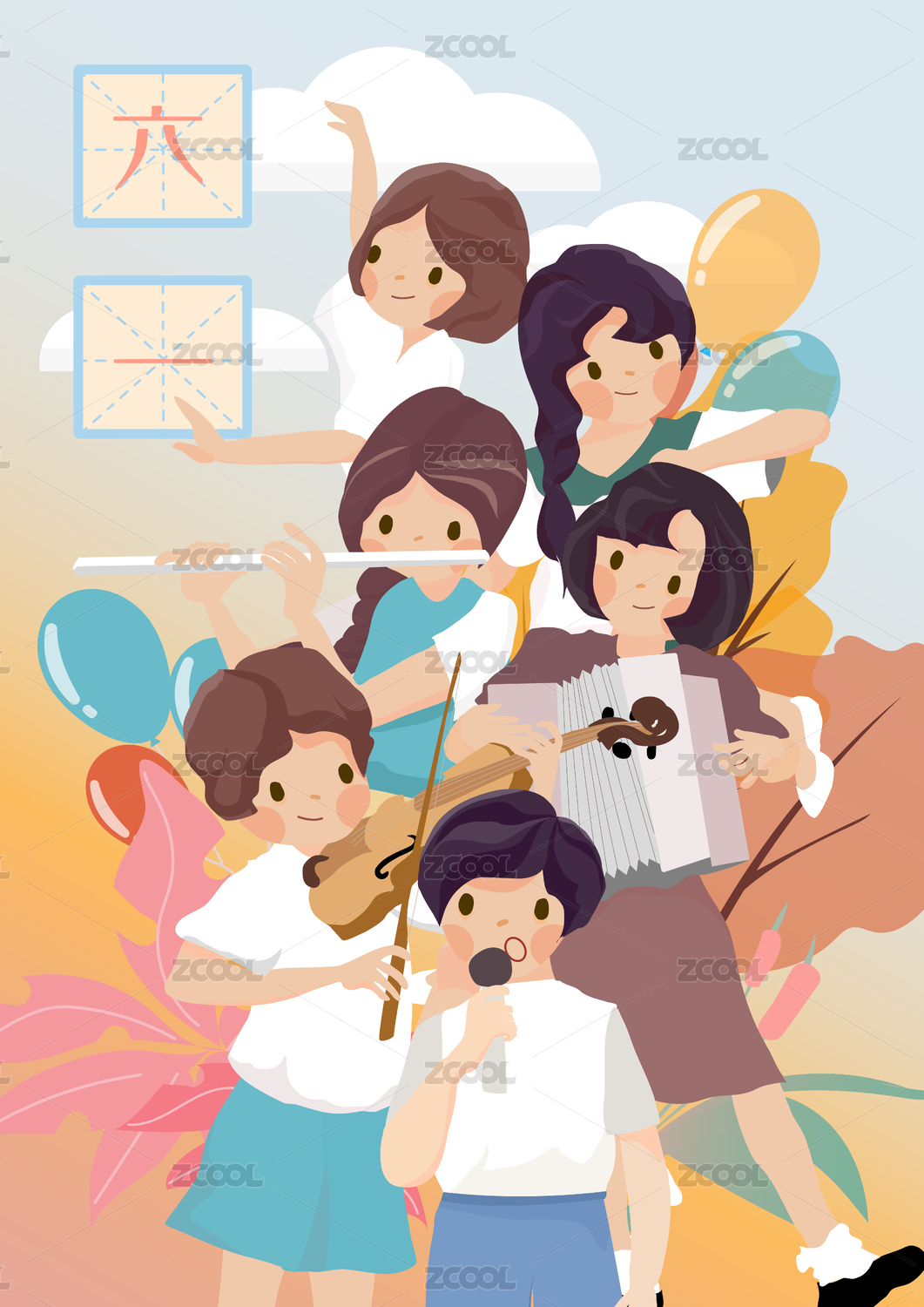 儿童孩子文艺唱歌跳舞小提琴手风琴笛子矢量