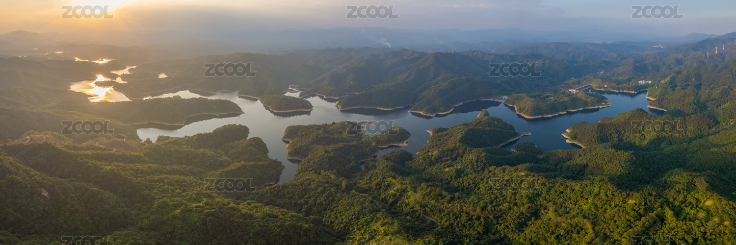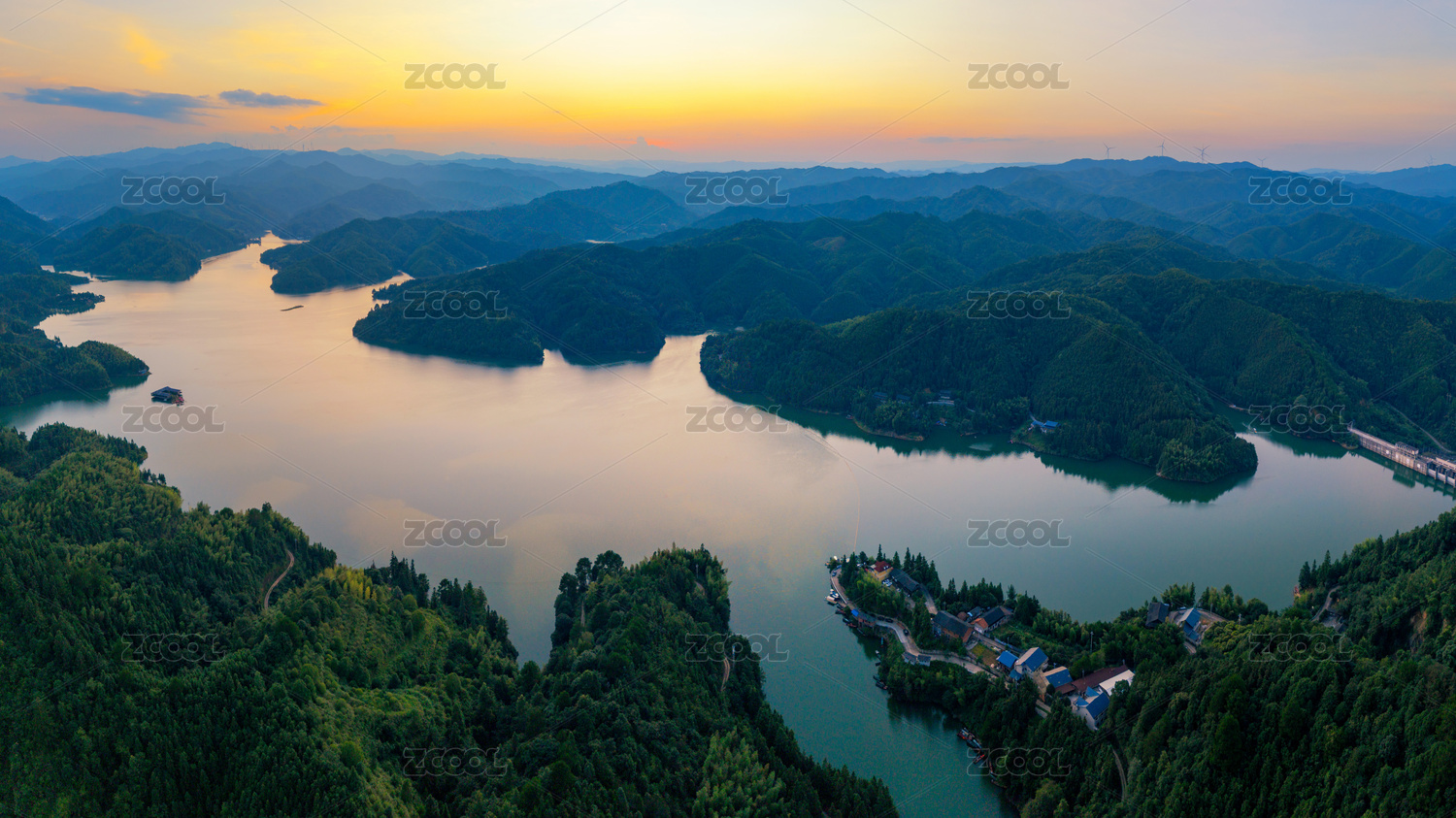 河源市东源县万绿湖镜花缘景区夕阳航拍
