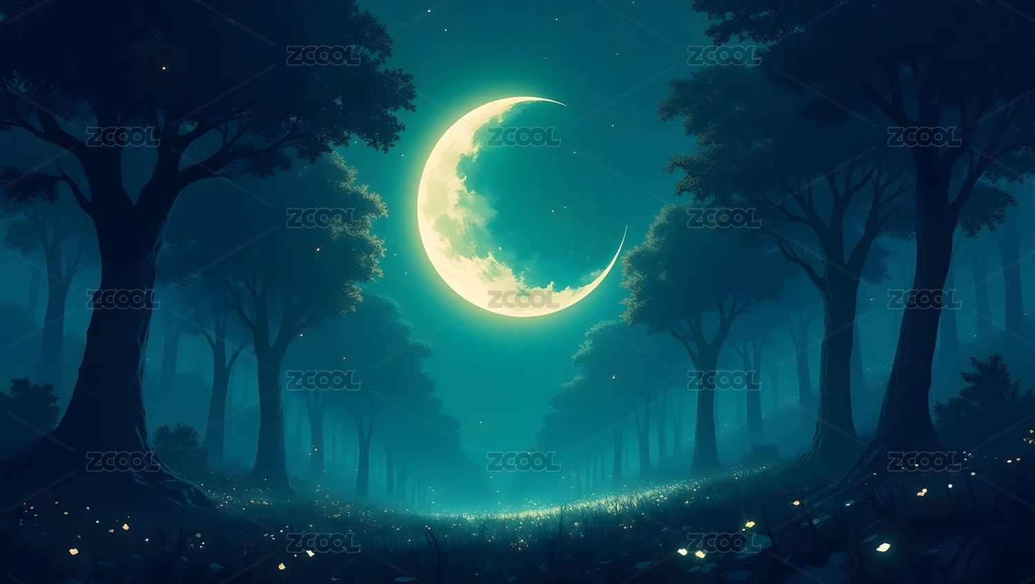 一只兔子在夜晚的山林间望向月亮的插画背景