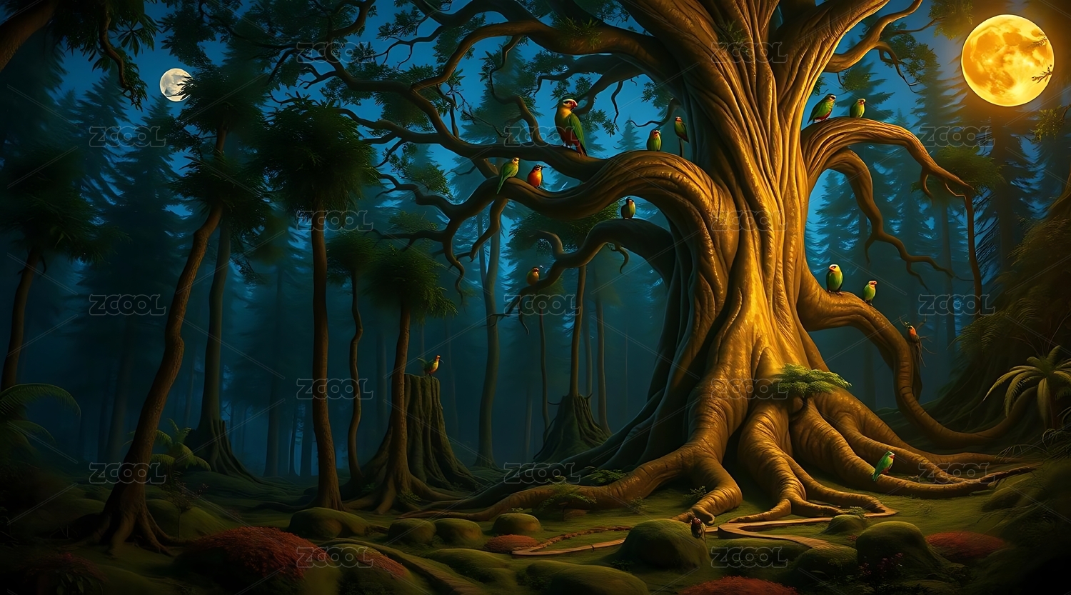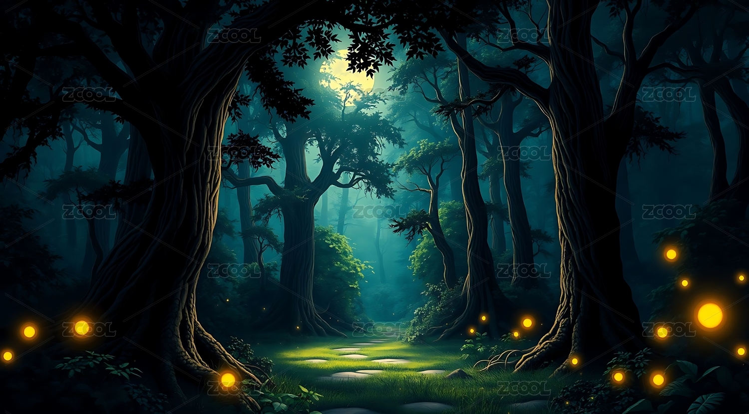 夜幕下的神秘森林满地的萤火虫和树影婆娑