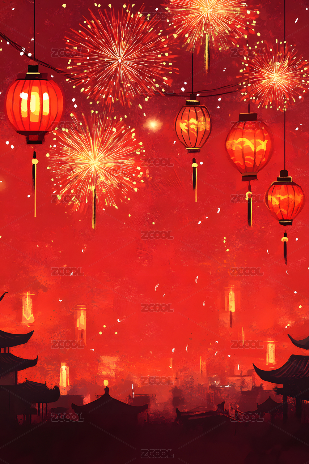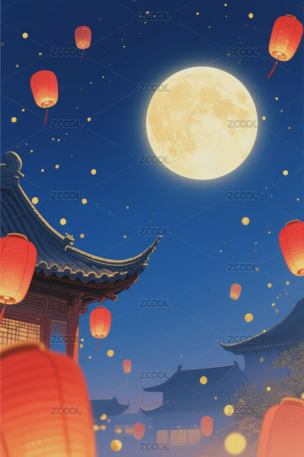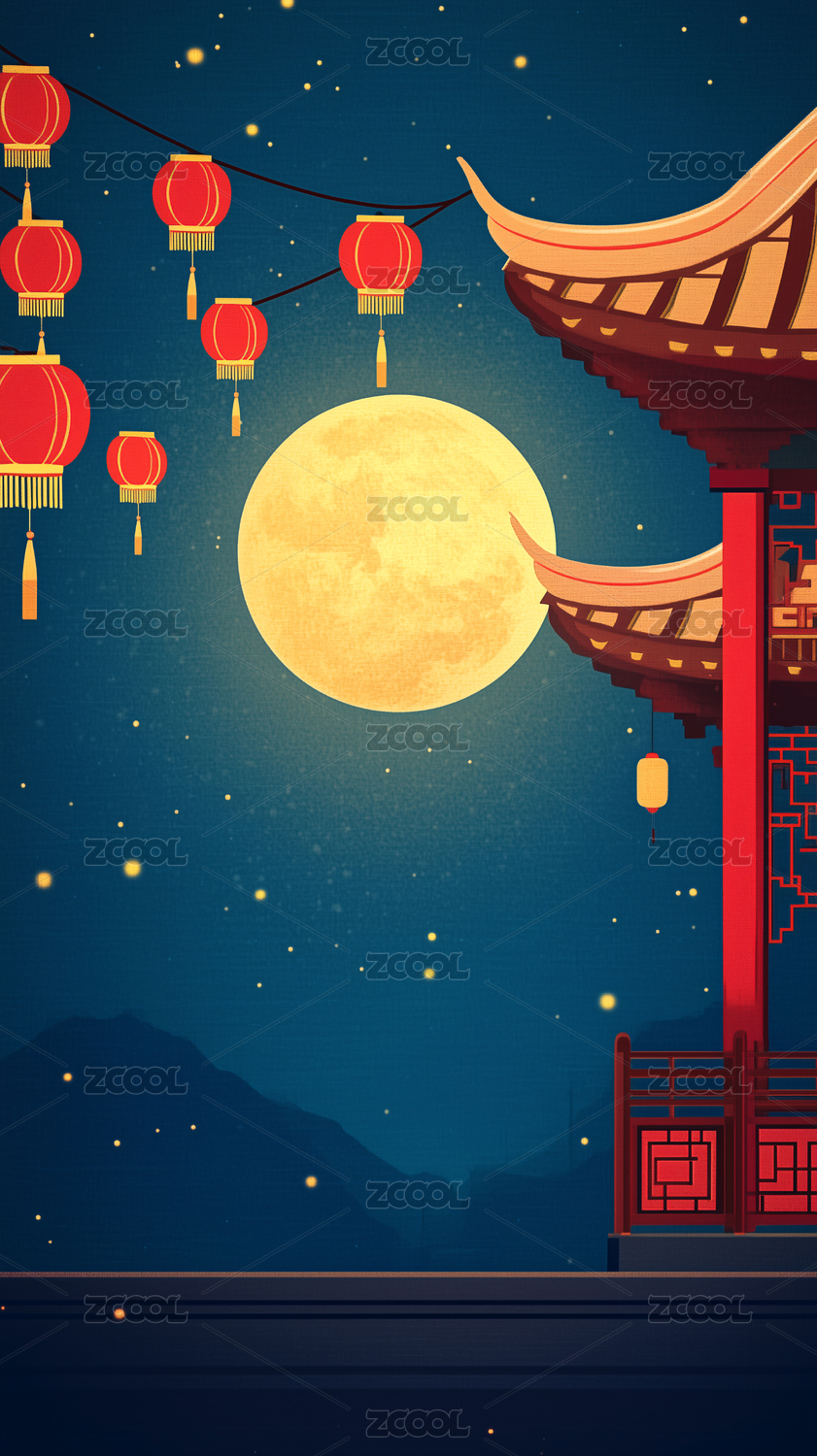 夜晚挂着传统红灯笼的中国古典建筑插画绘画