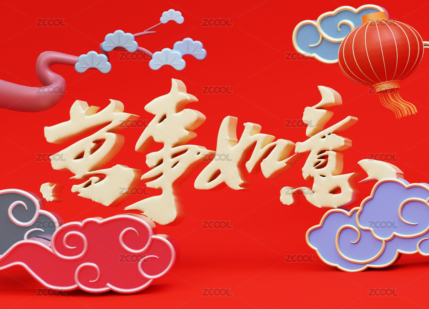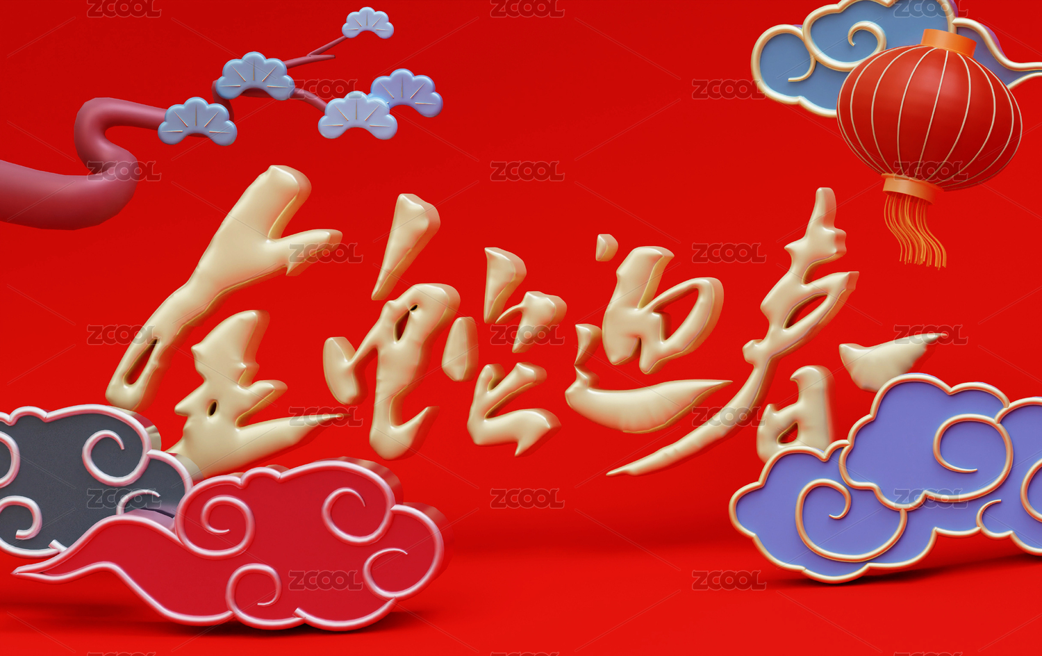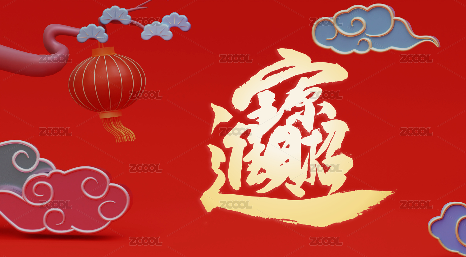 3D创意设计中国蛇年新春灯笼卷轴书法年会