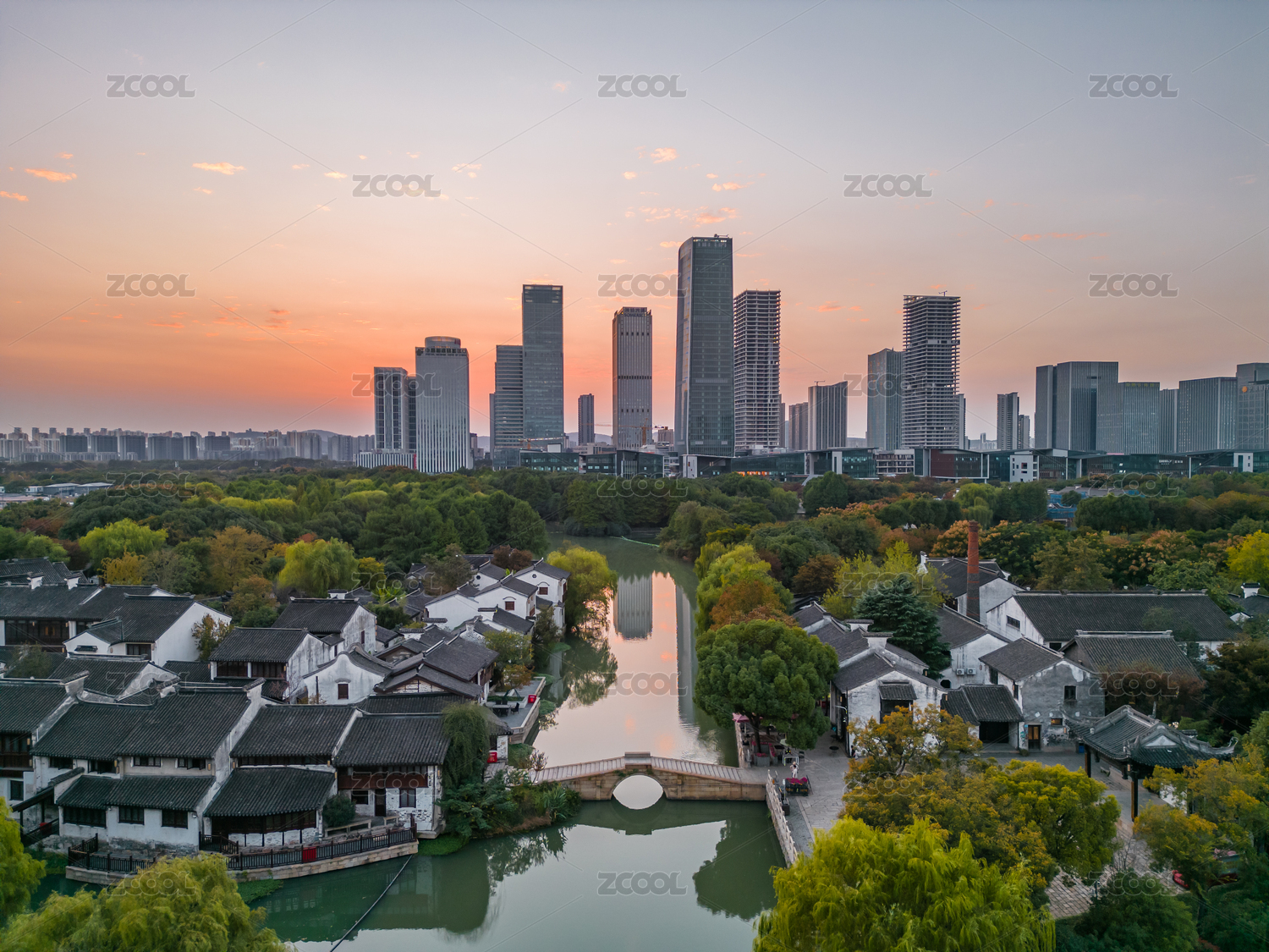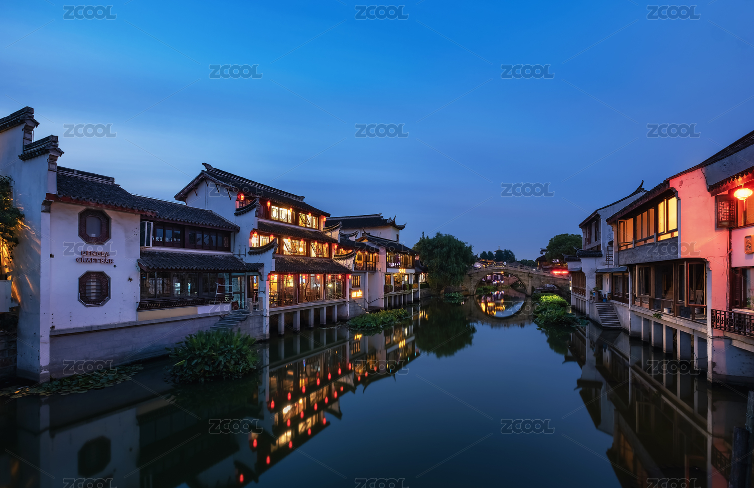 黄昏晚霞夜色中的江苏无锡巡塘古镇建筑景观