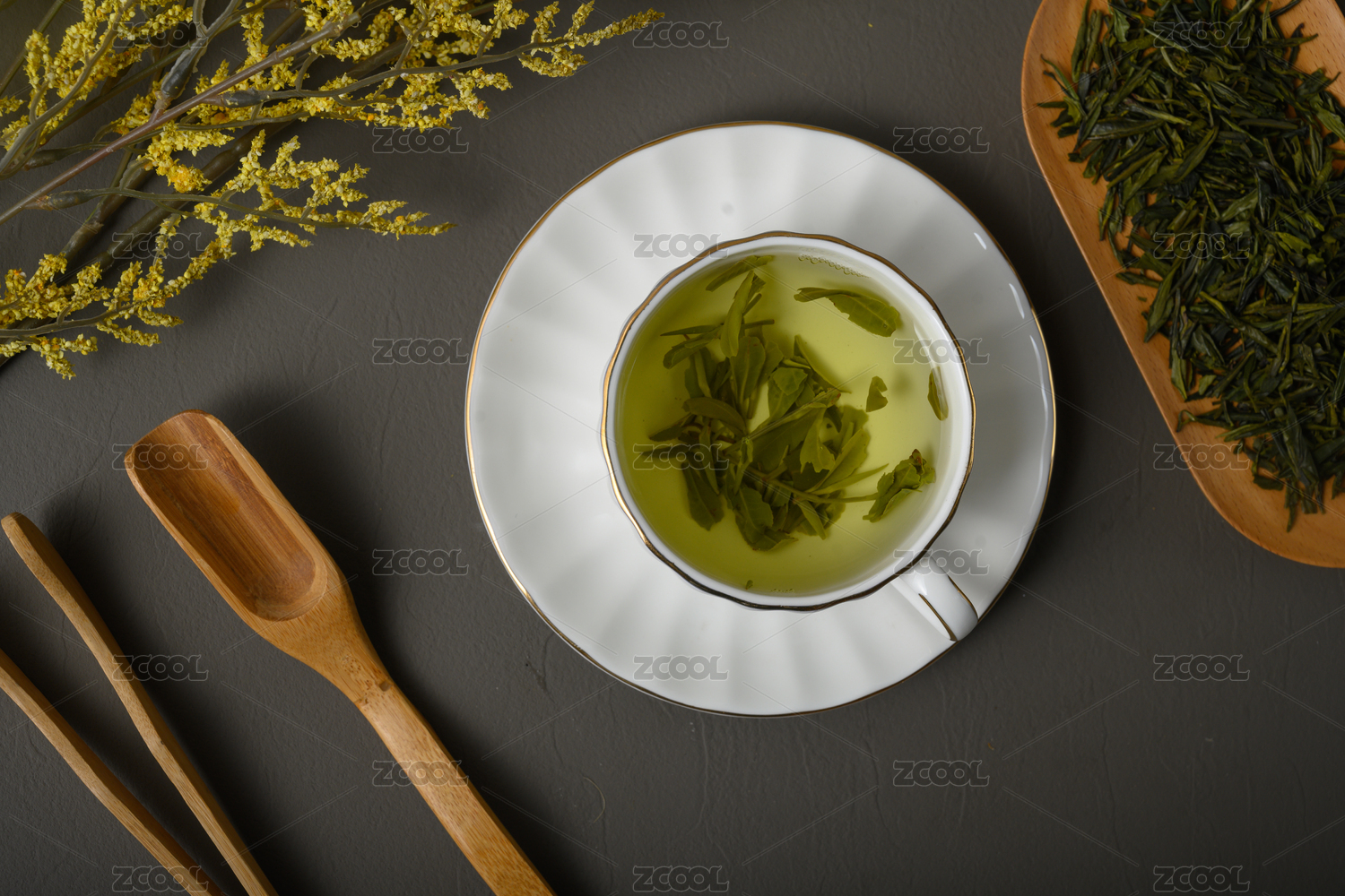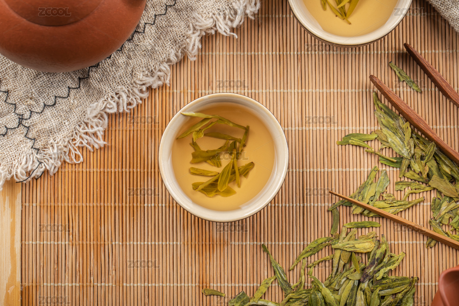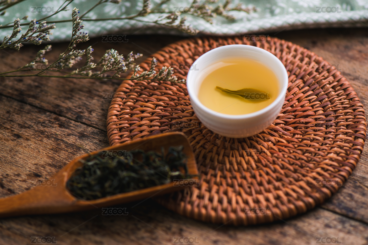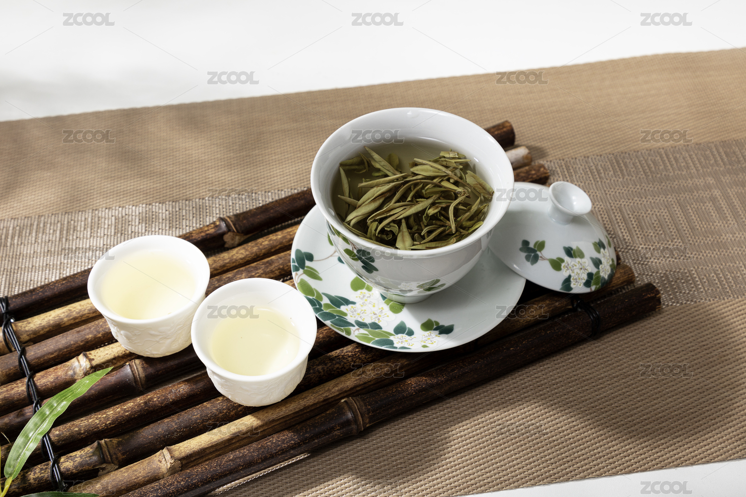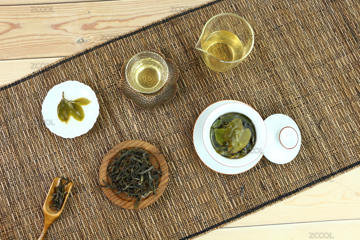 中国传统复古盖碗里面泡着新鲜的绿茶