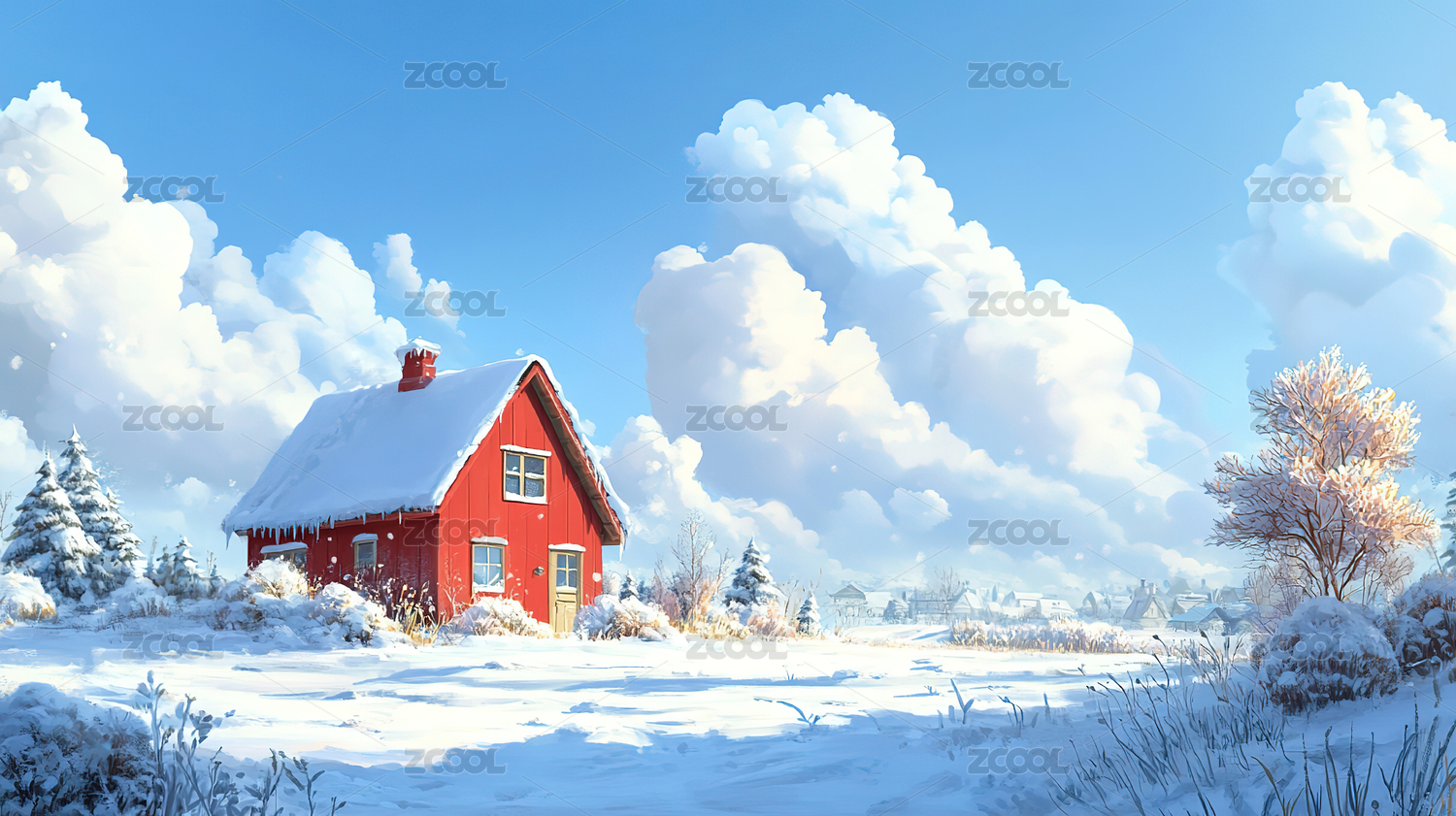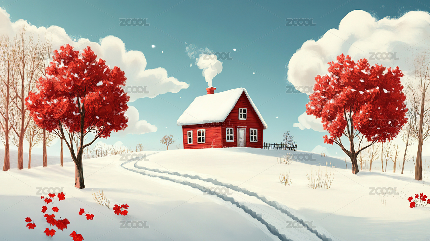 唯美冬天风景插画,湖边被雪覆盖的小屋