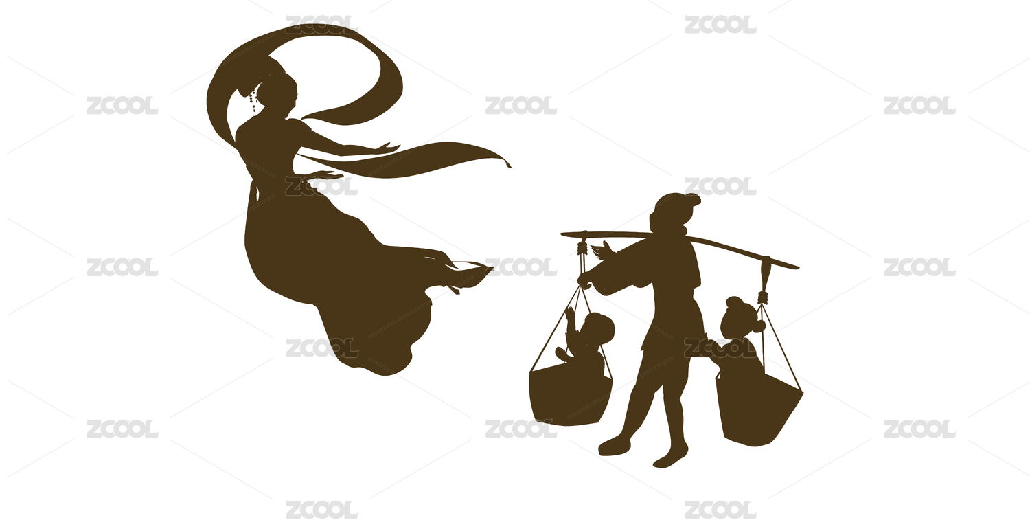 七夕牛郎织女儿女鹊桥相会剪影古装人物元素