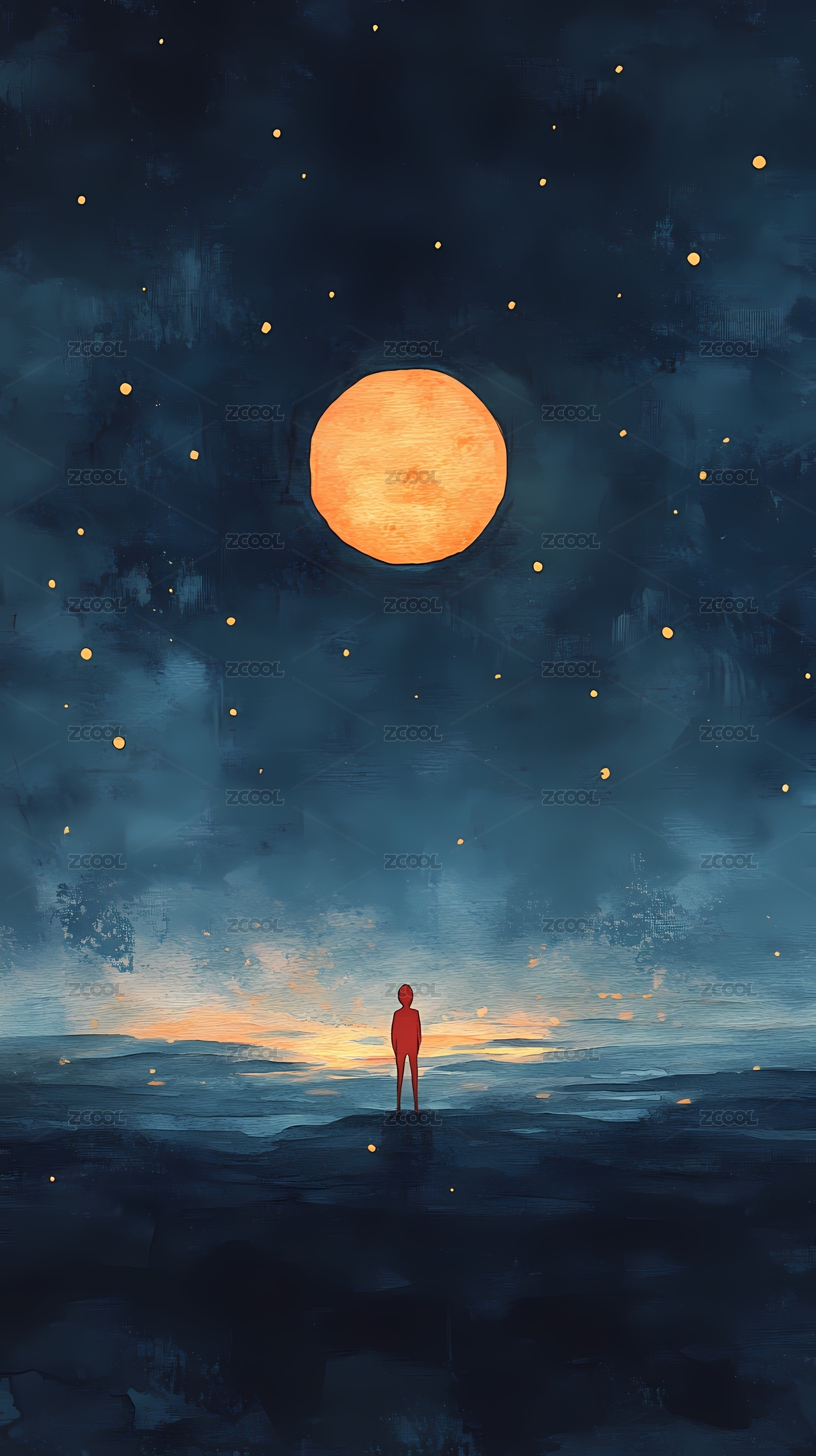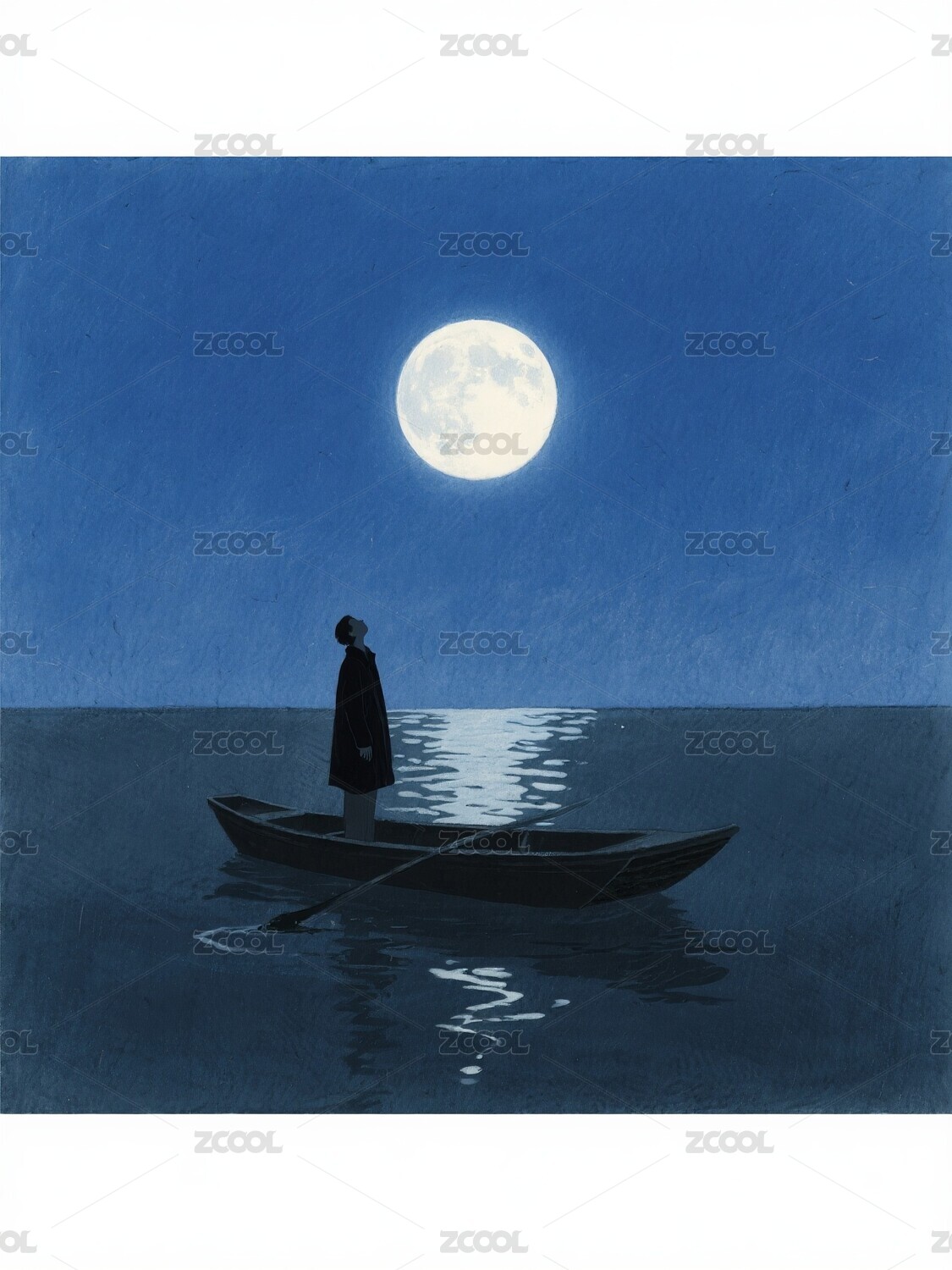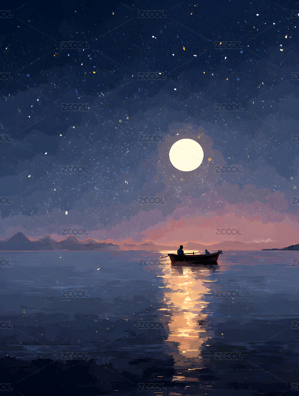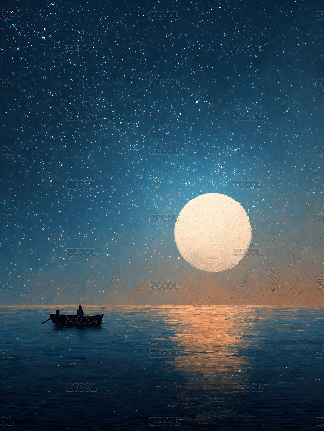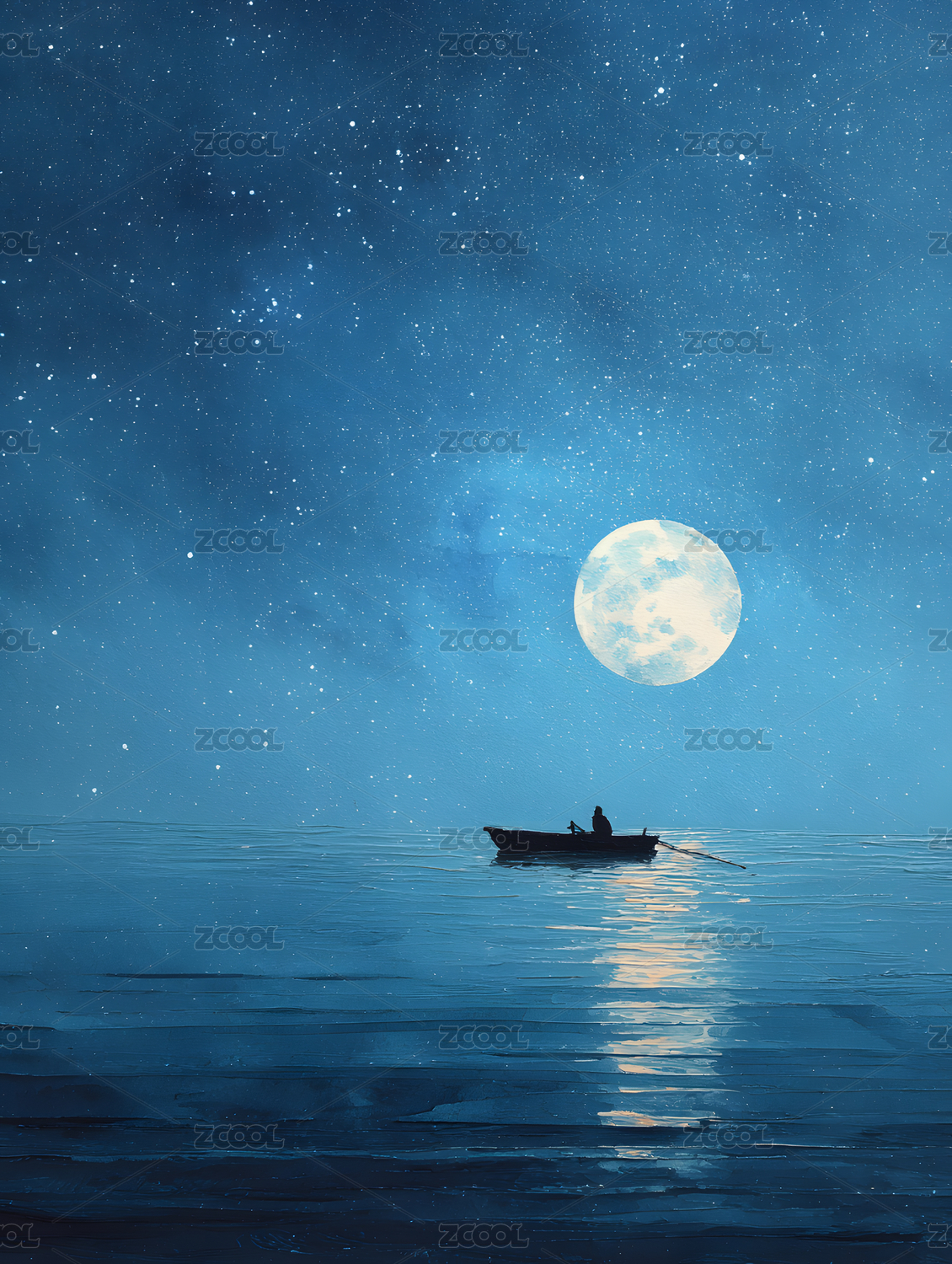 月亮,男孩,打海,星星,星光,月光,小船,收集,星河,水平面