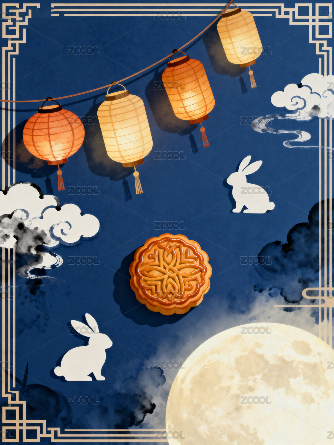中秋节边框兔子月饼插画图案