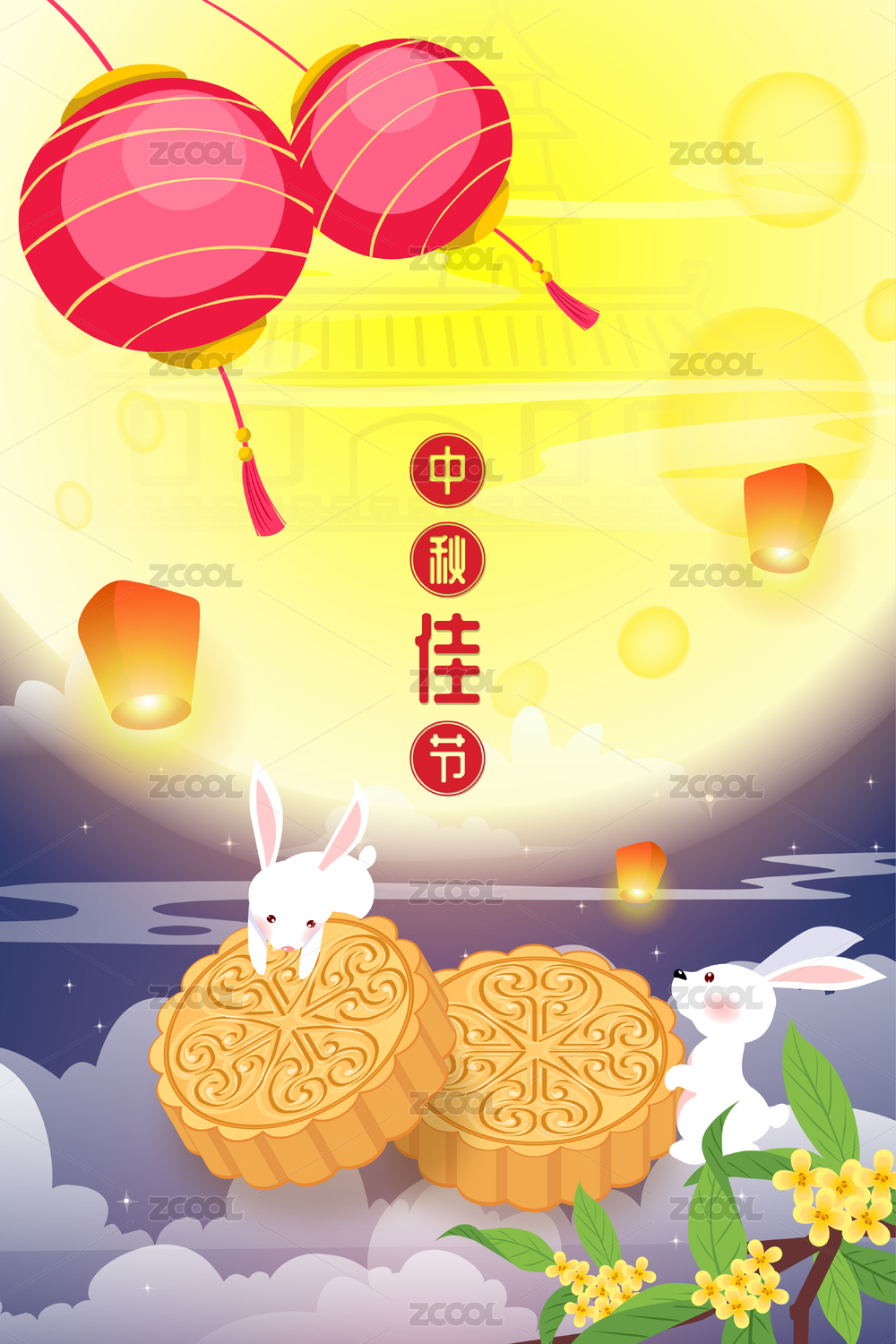 中秋节桂花兔子灯笼皓月扁平竖版矢量图插画