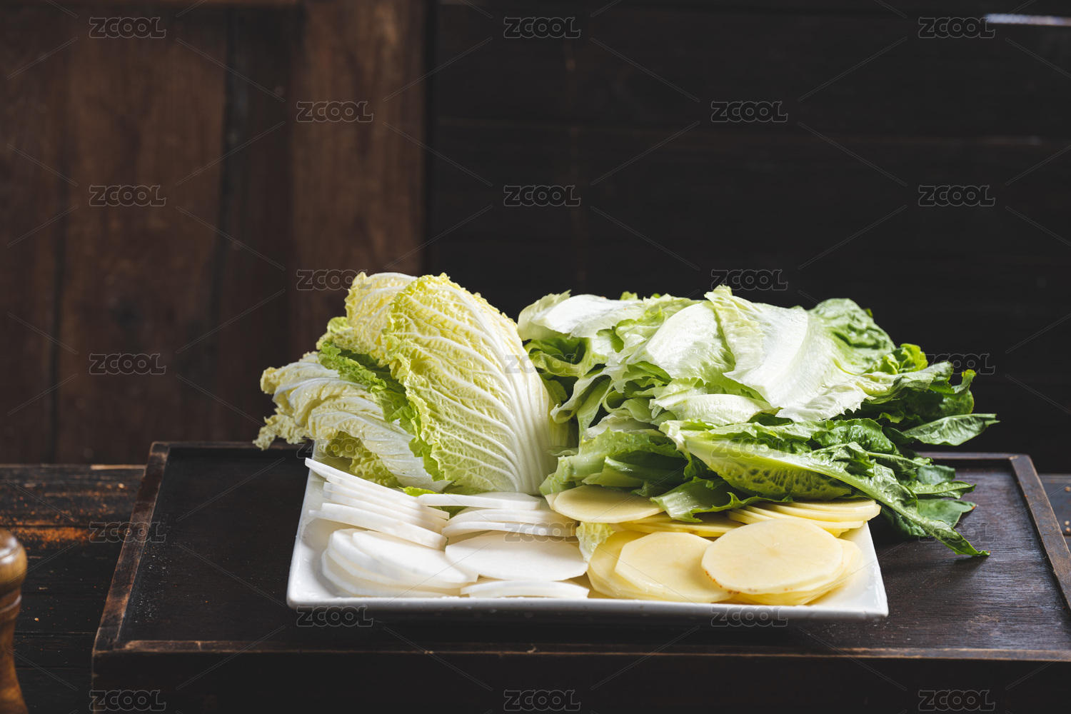 生菜叶,木耳,蔬菜拼盘,棕色木纹桌面,暗色调