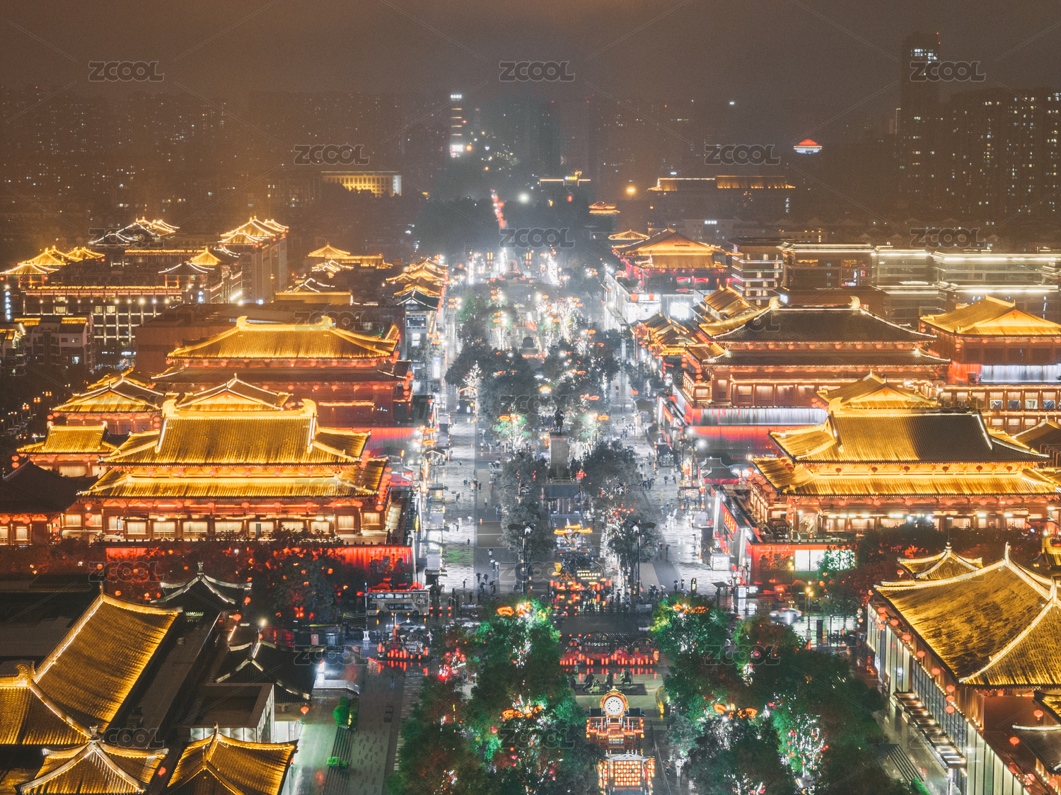 中国陕西西安大雁塔大唐不夜城夜景航拍风光