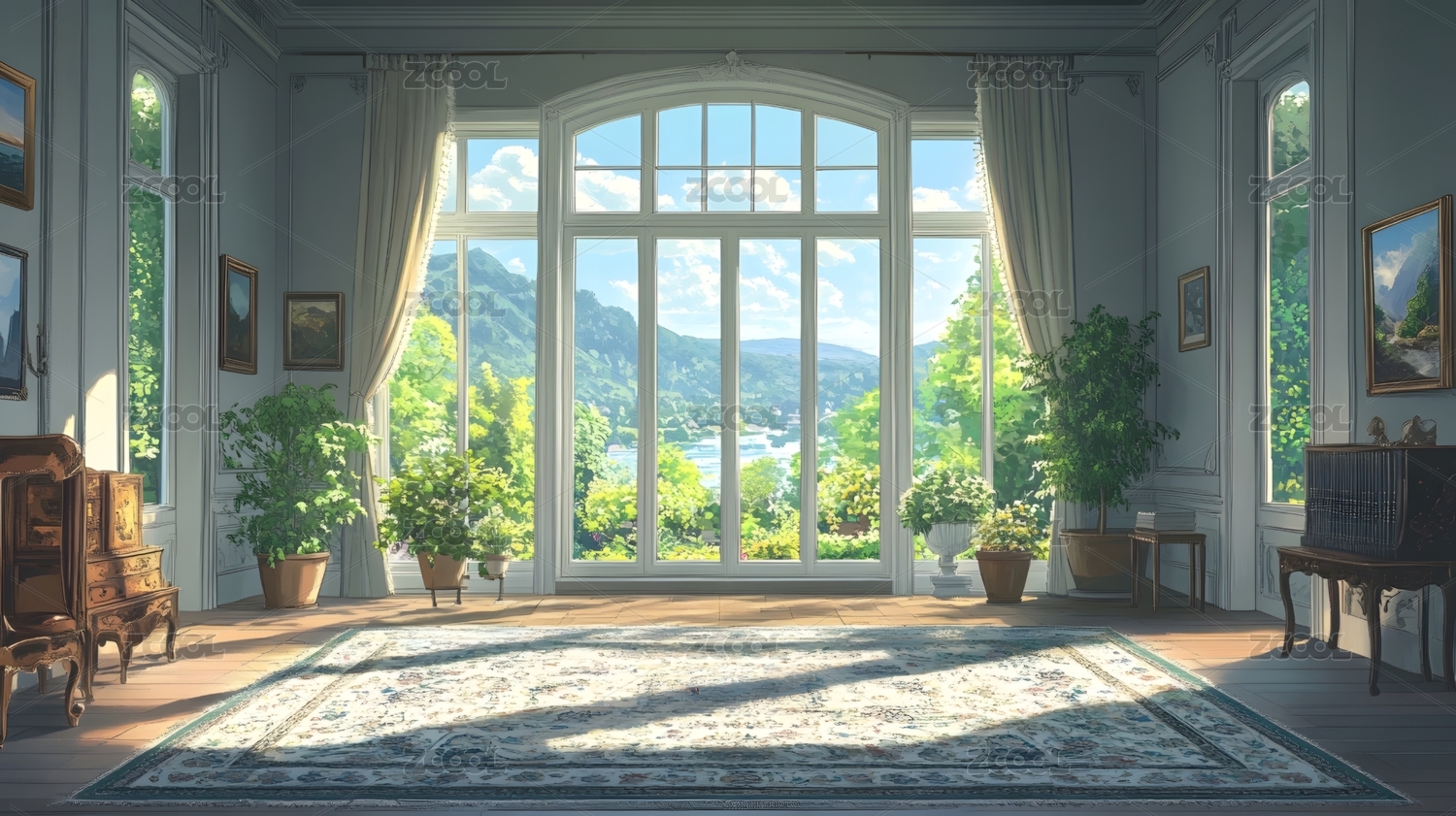 春天白天阳光下门窗外粉花绿色原野3D插画