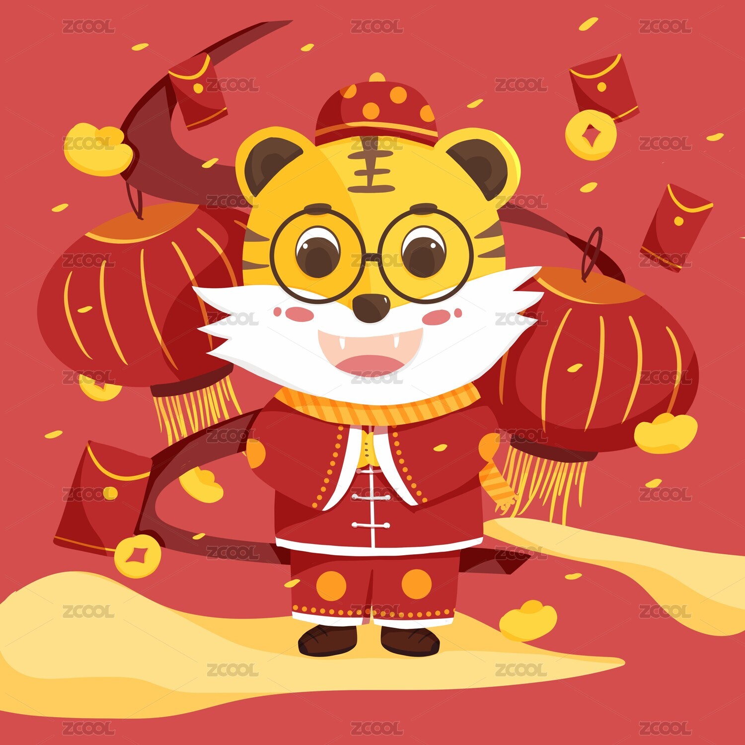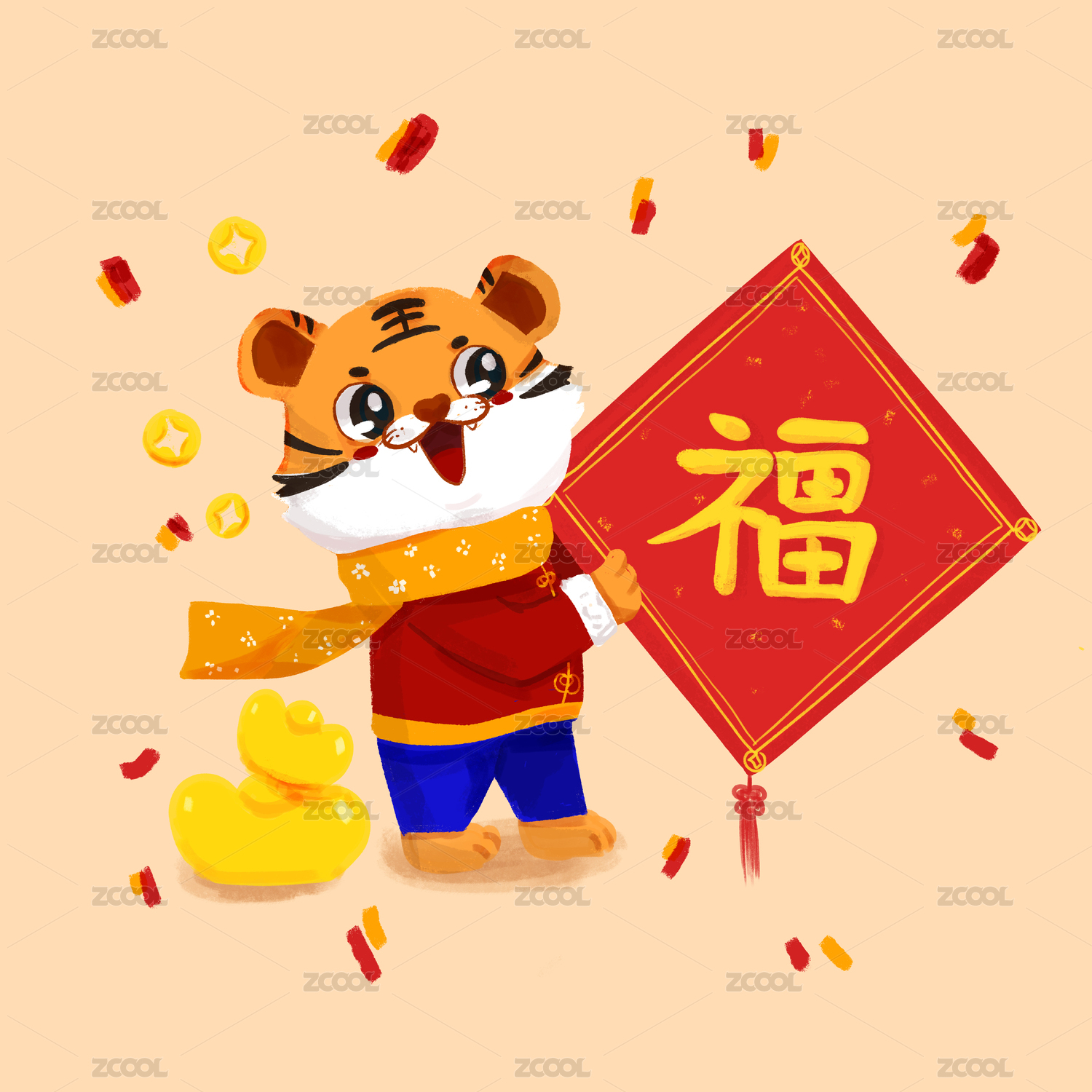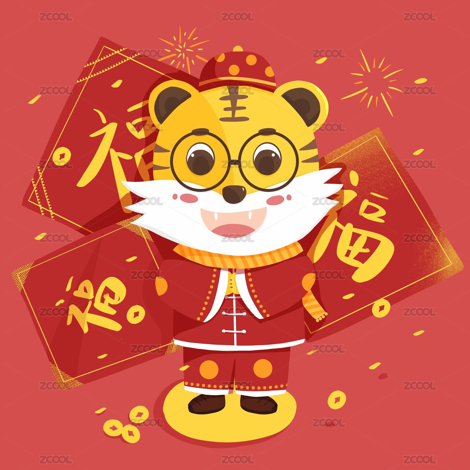 虎年春节喜庆插画新年卡通老虎喜庆贺岁海报