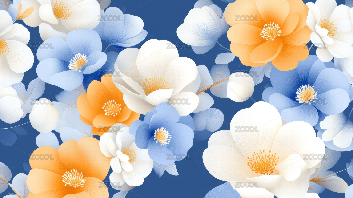 蓝色背景上的橙色和白色花朵图案