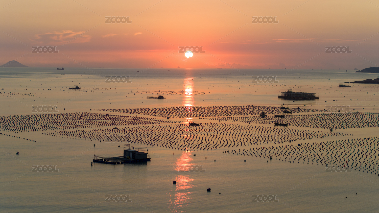 中国浙江嵊泗花鸟岛日落下的海上渔场航拍