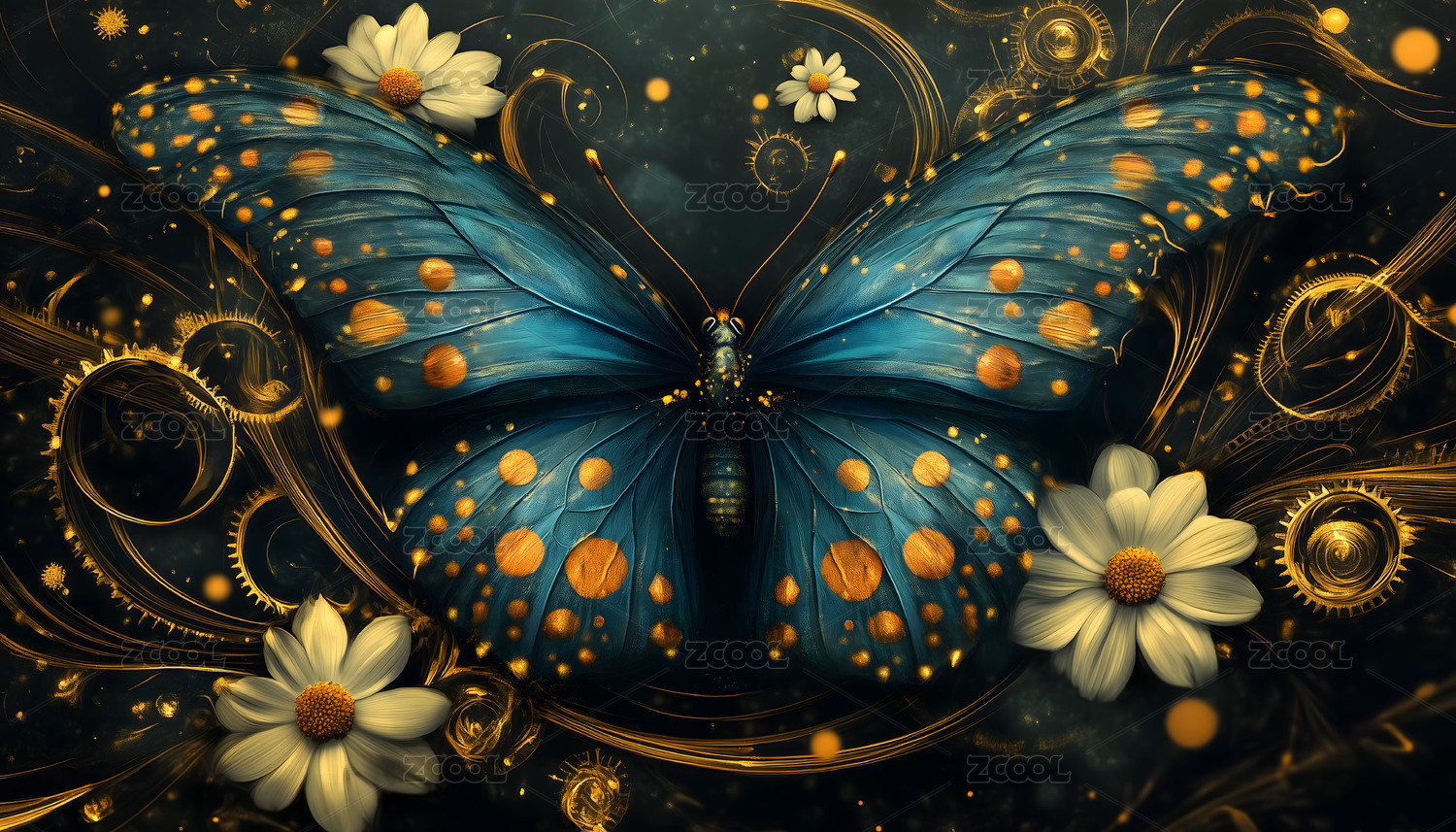 蝴蝶,机械齿轮,花朵,艺术,绘画,蓝色,金色,装饰,纹理,背景