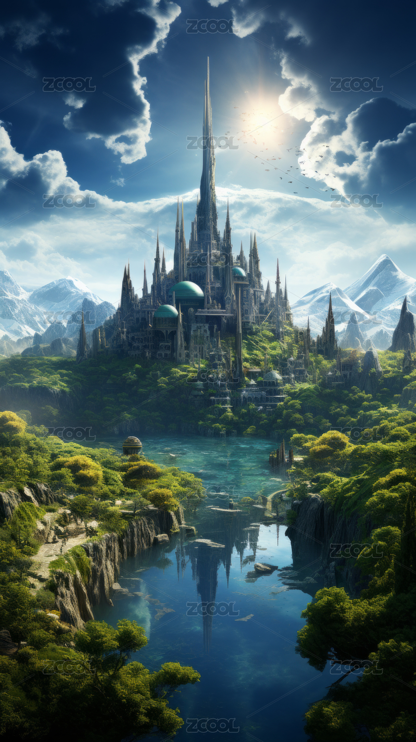 神话风格高山上的古老建筑和瀑布