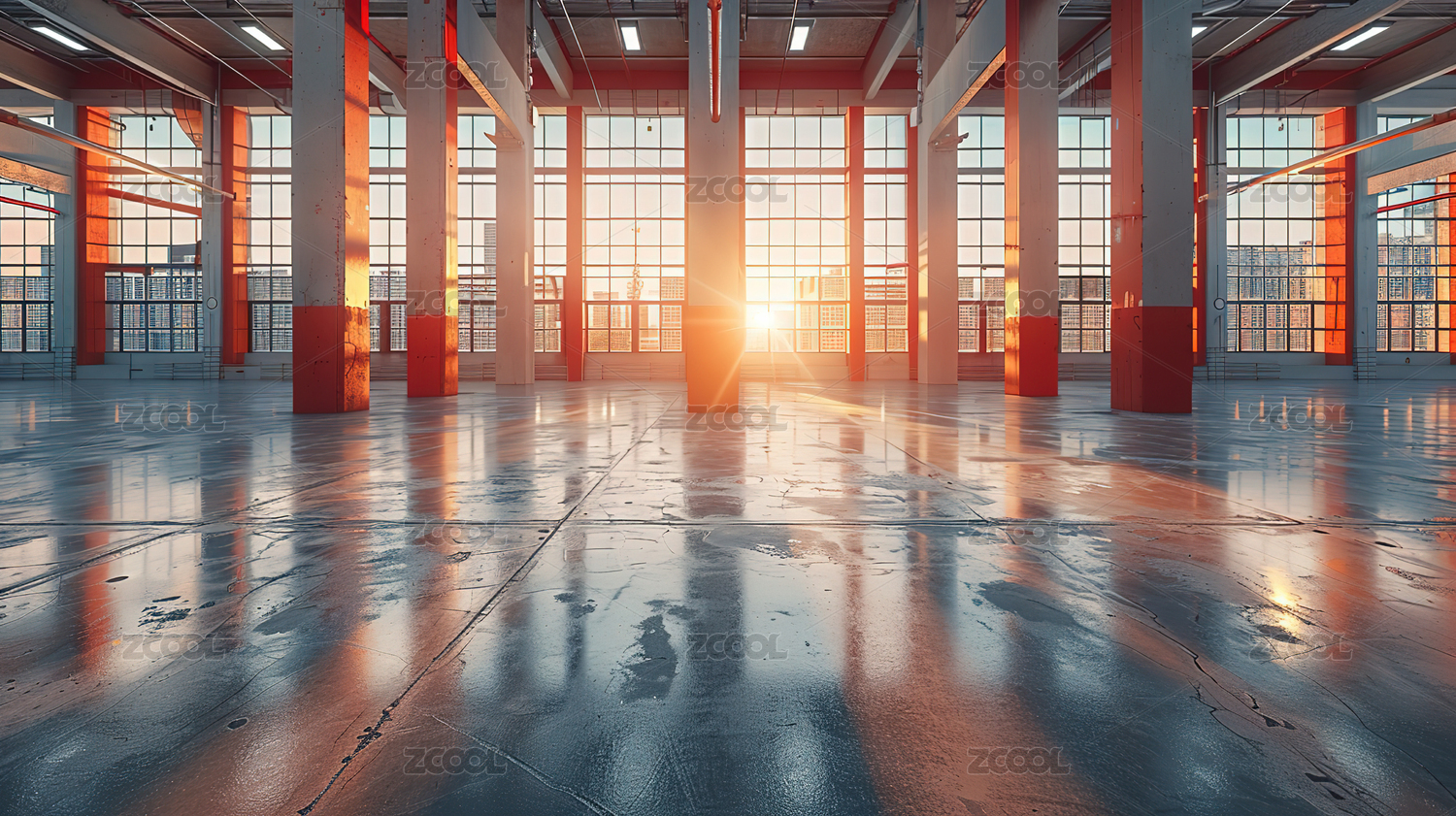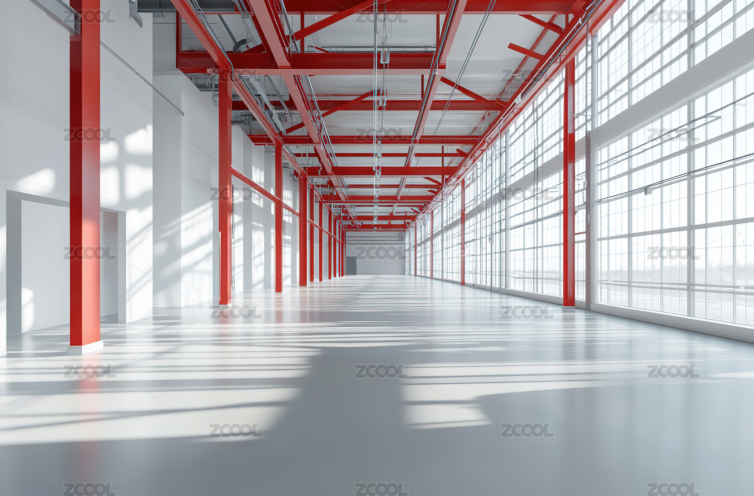 阳光下现代宽敞明亮的工厂仓库室内空间