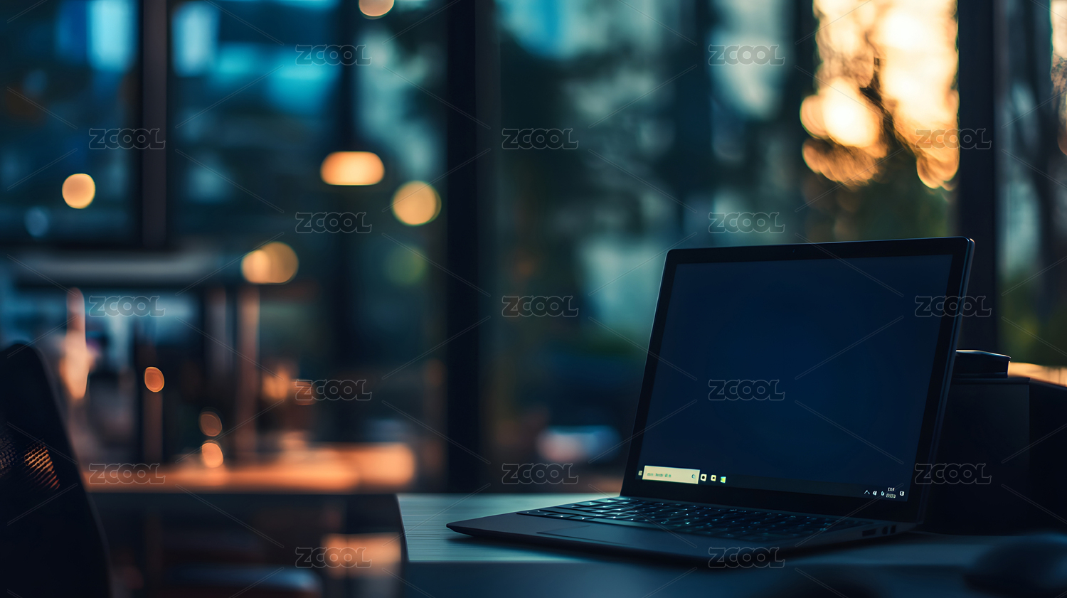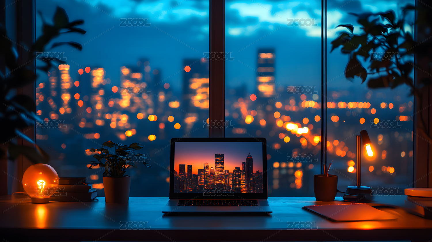 城市夜景中的办公桌面场景