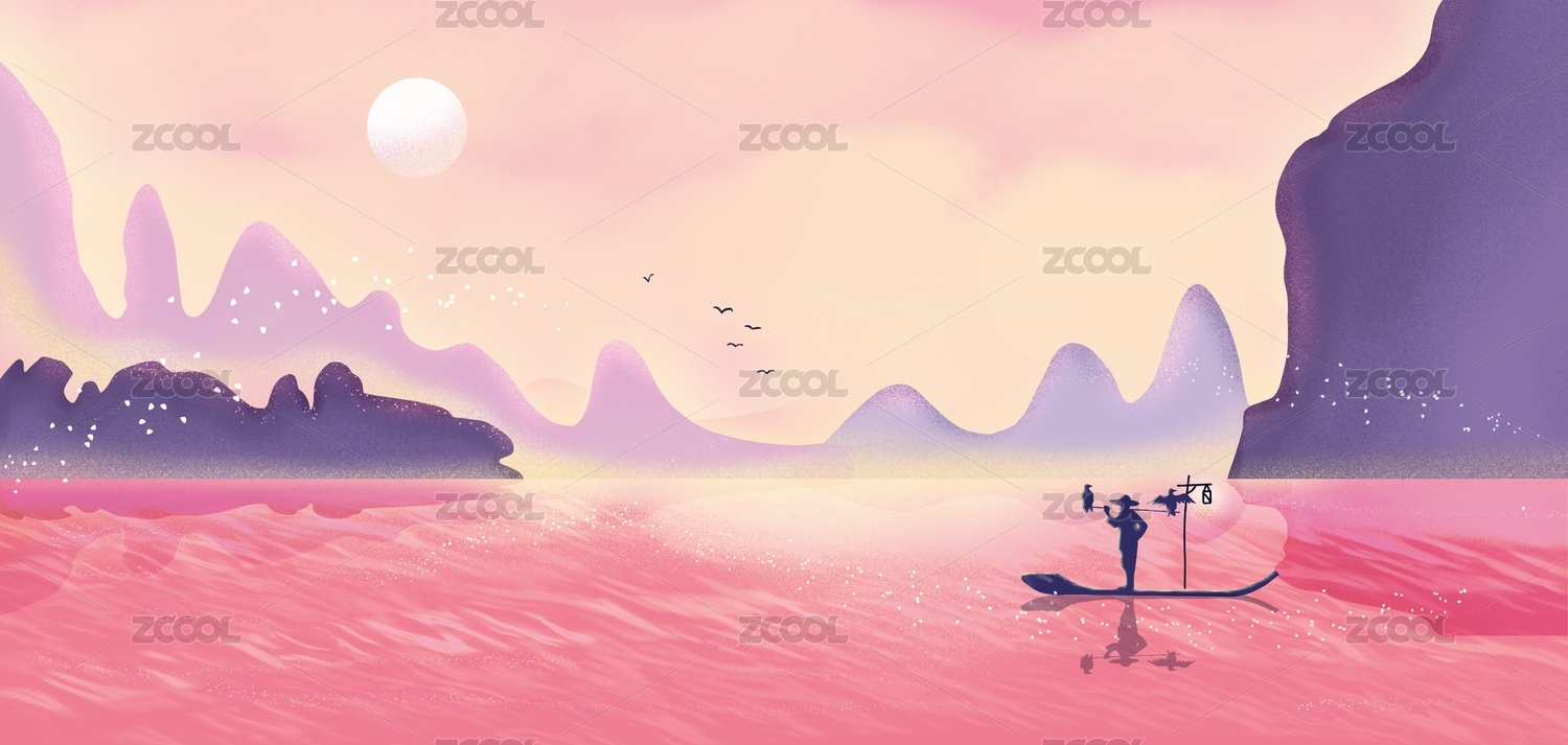 国潮中国风湖面上渔夫远山山水水墨风景插画