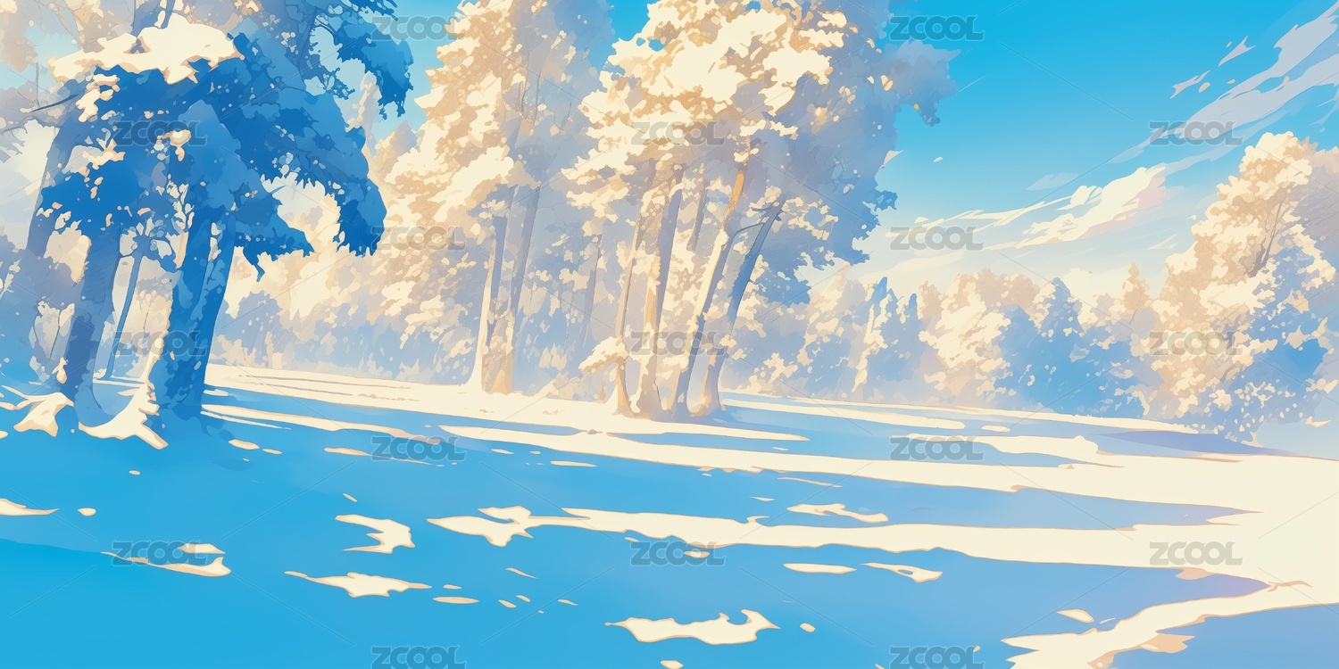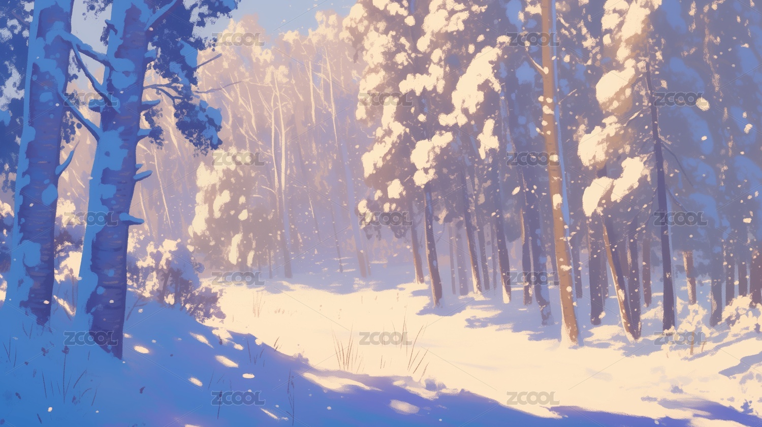 清新明亮冬天有厚厚的积雪的树林插画绘画