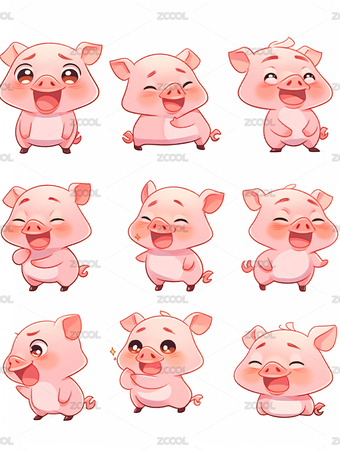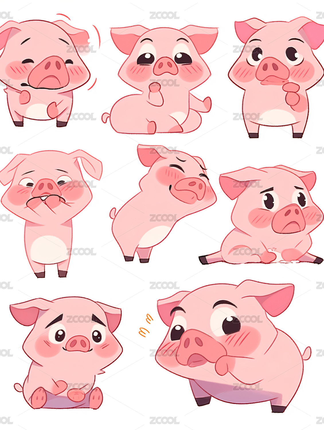 可爱粉红色蜡笔风格的小猪表情包形象插画艺术设计