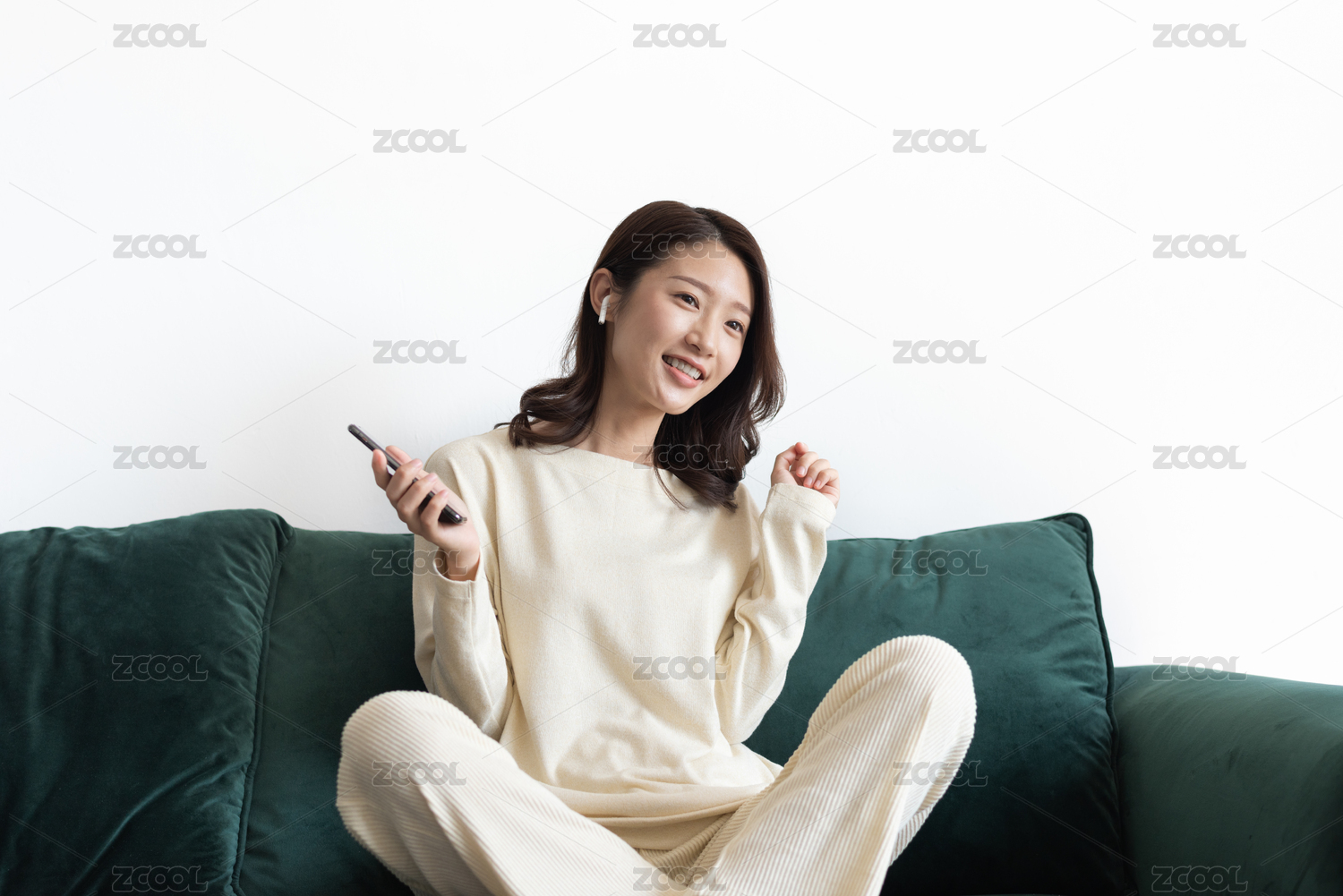 一名年轻女性在家里的客厅坐在沙发上戴着无线耳机听歌