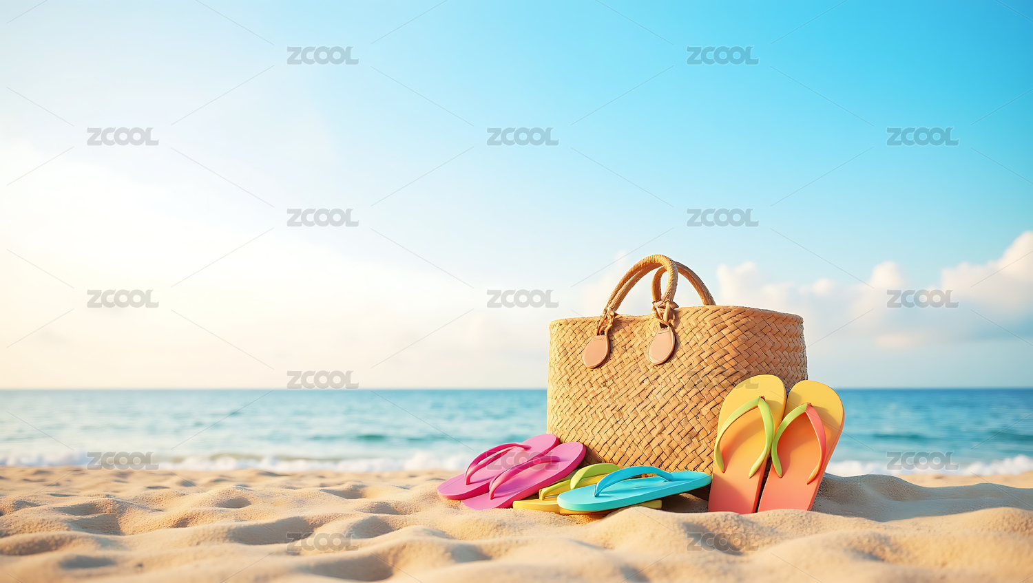 沙滩上的遮阳伞旅行箱 旅游度假概念