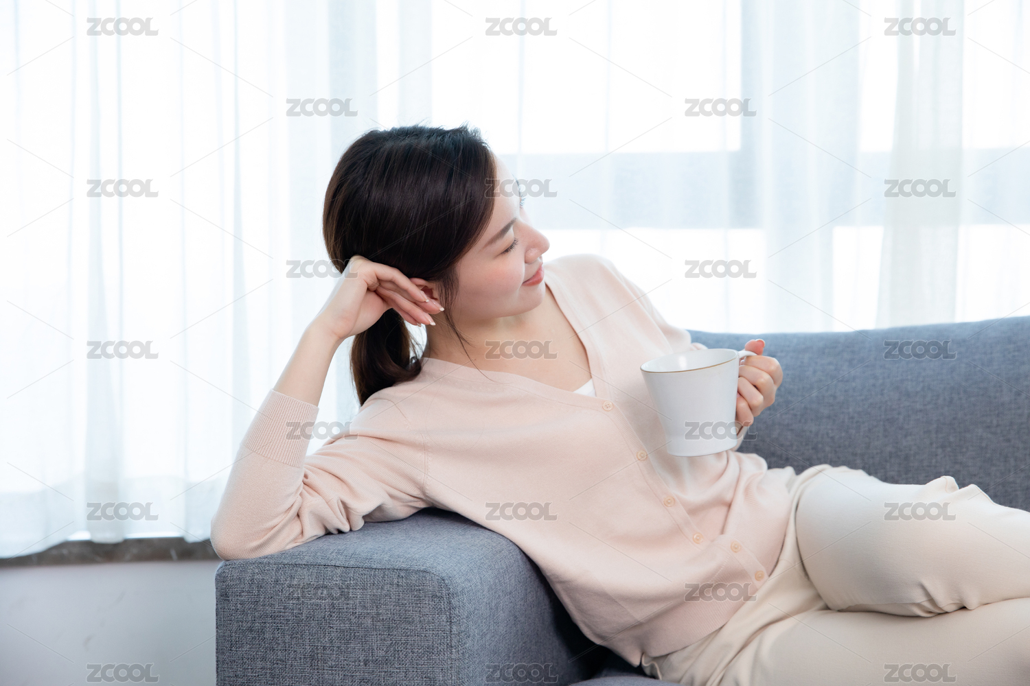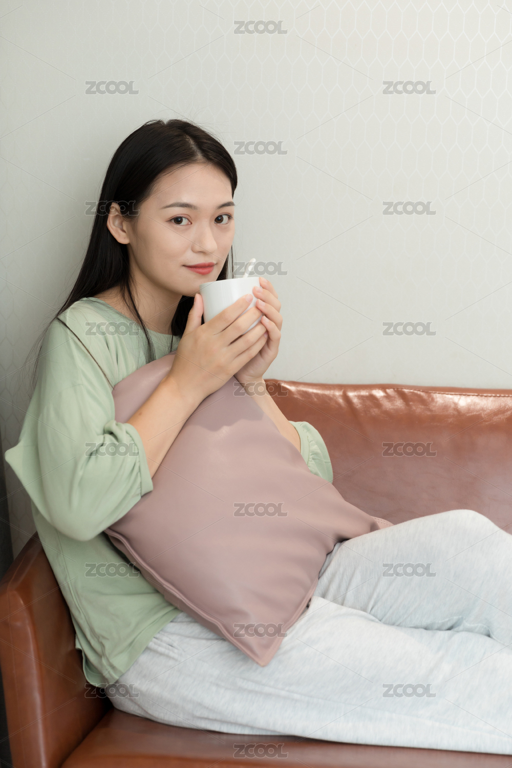 年轻女性拿着水杯坐在客厅沙发上看电视