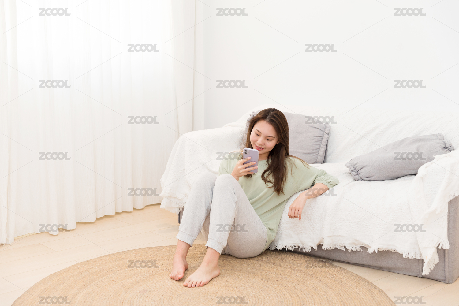 年轻的亚洲女生拿着手机靠在沙发上思考