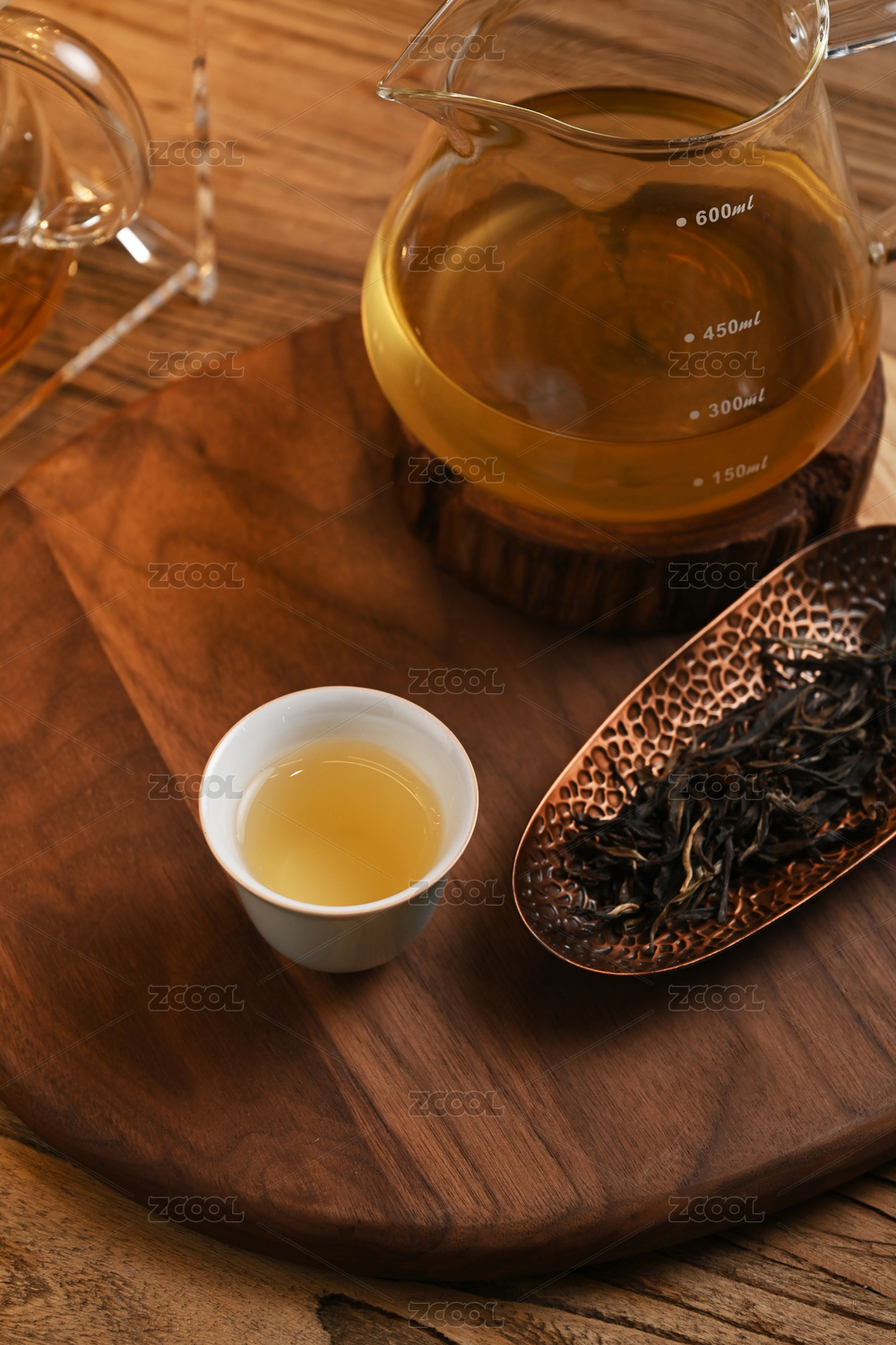 桌面上的竹盘子里的金骏眉和玻璃杯里的红茶