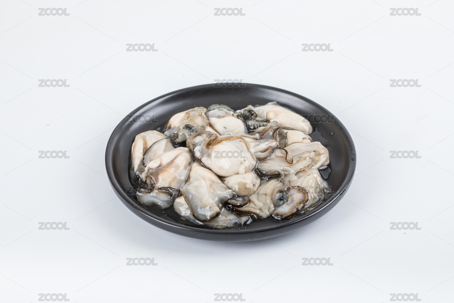 装在黑盘里的新鲜牡蛎肉放在白背景上
