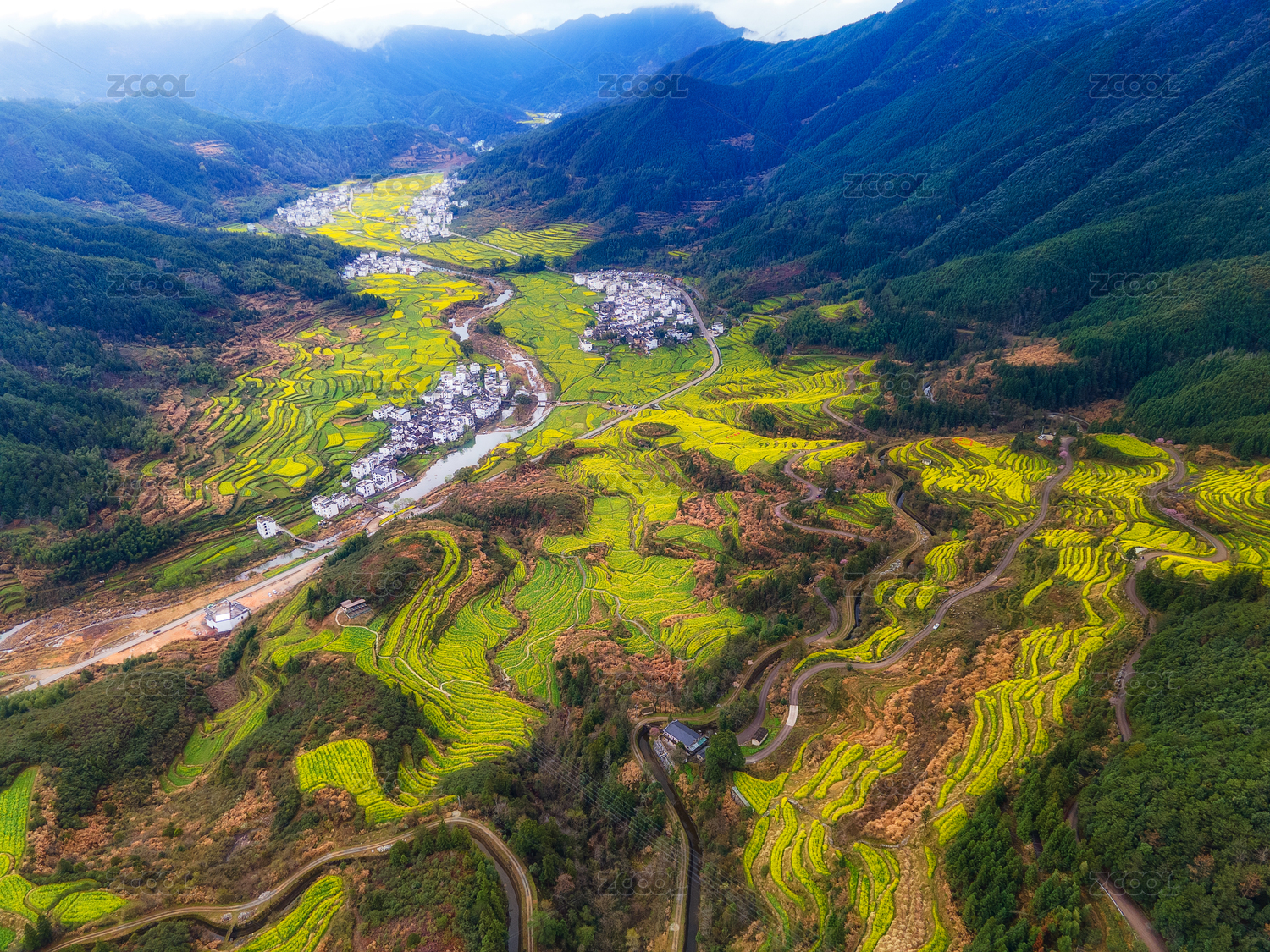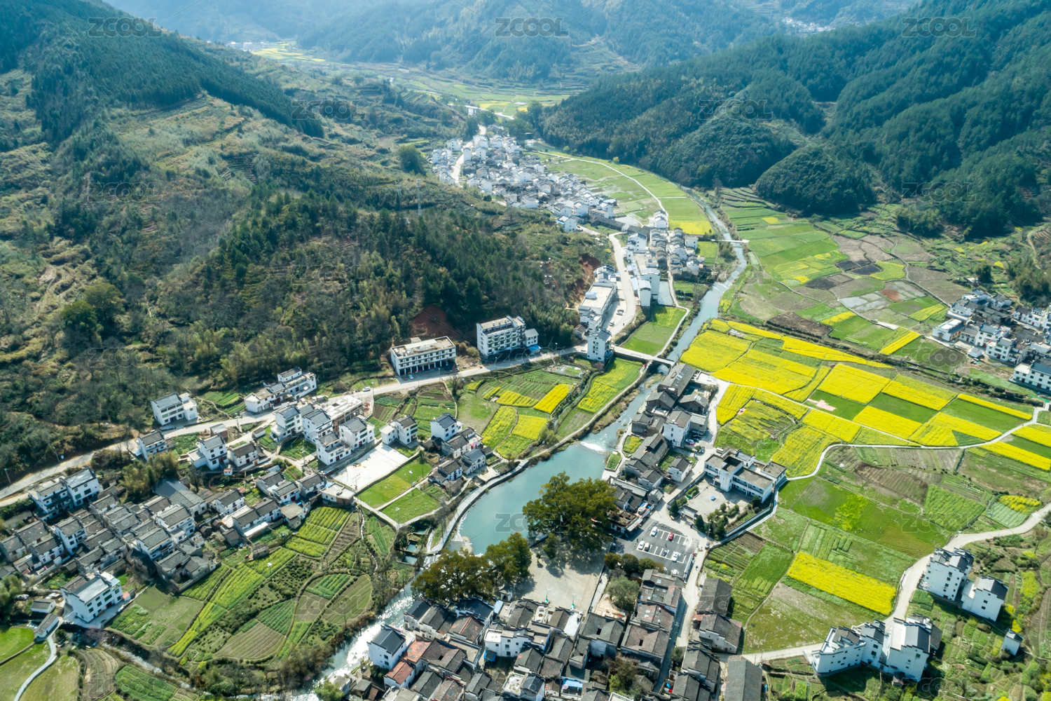 俯瞰江西婺源虹关村油菜花田园风光
