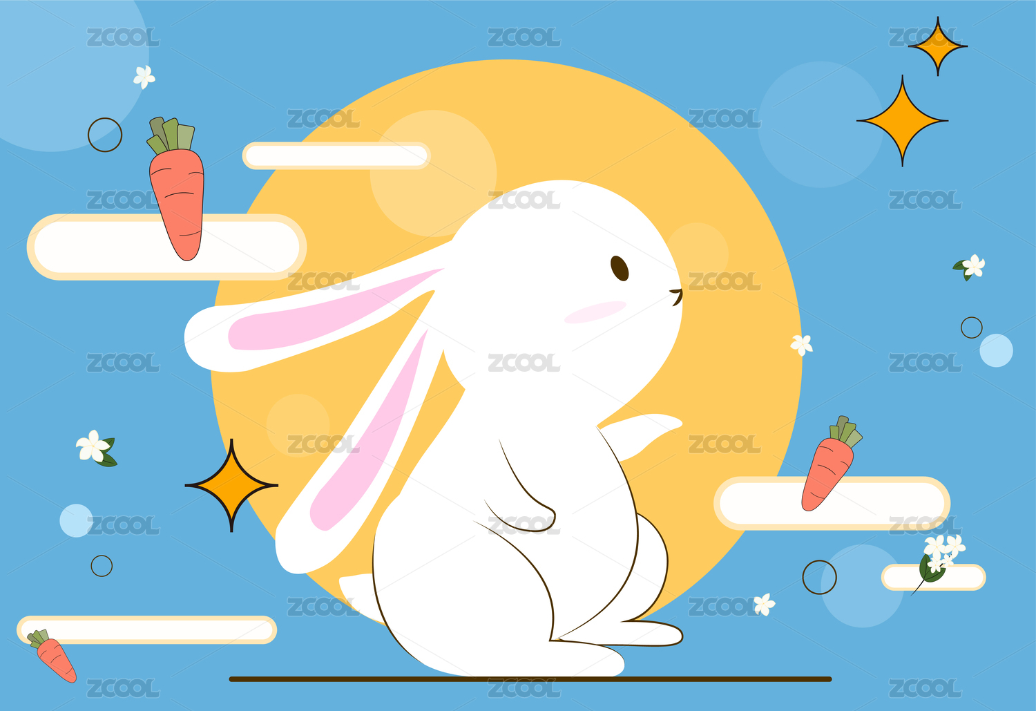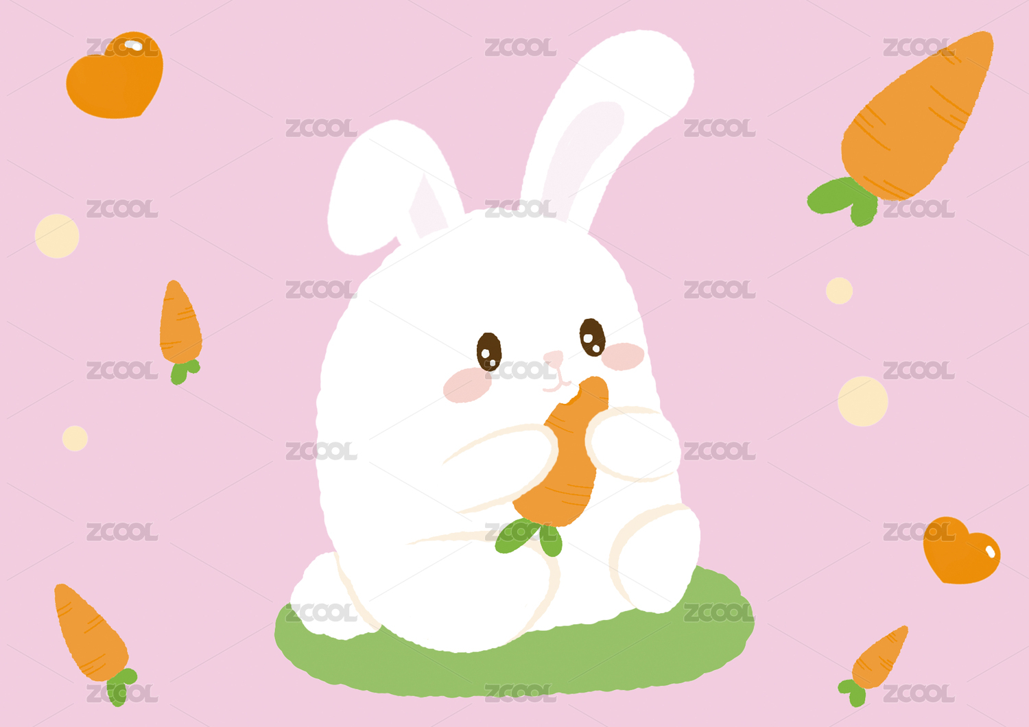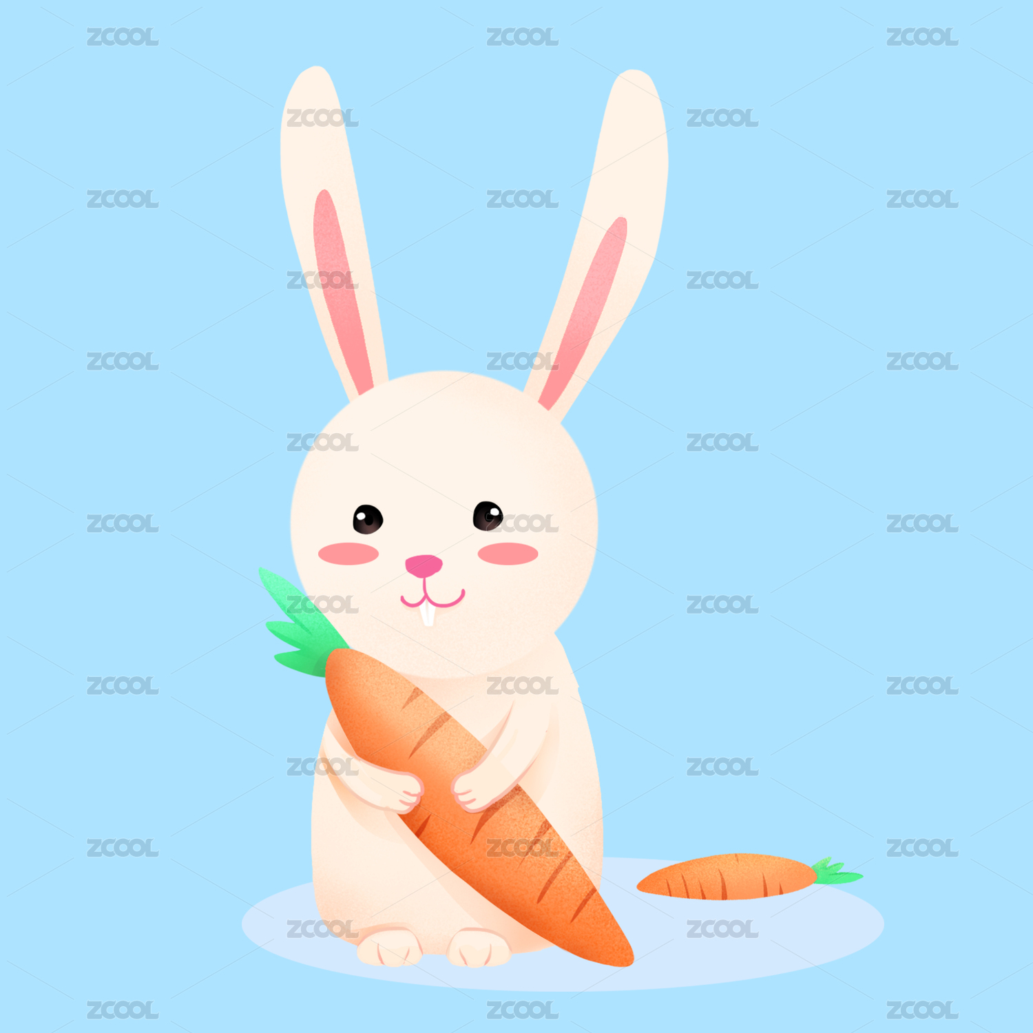 扁平风格可爱的小兔子抱着胡萝卜坐在草地上