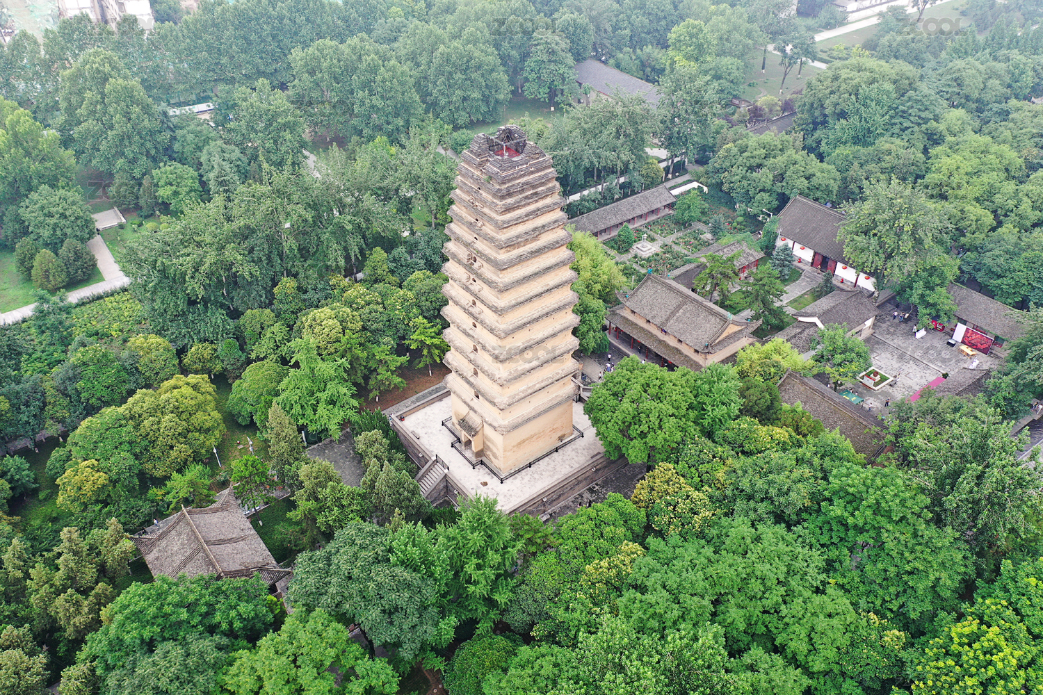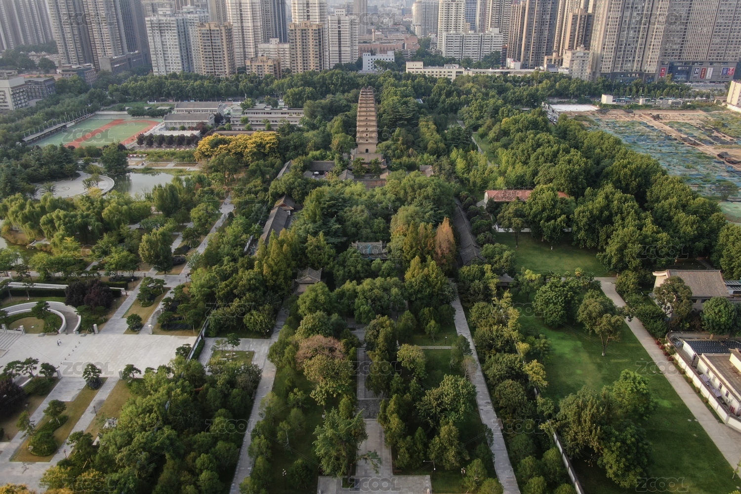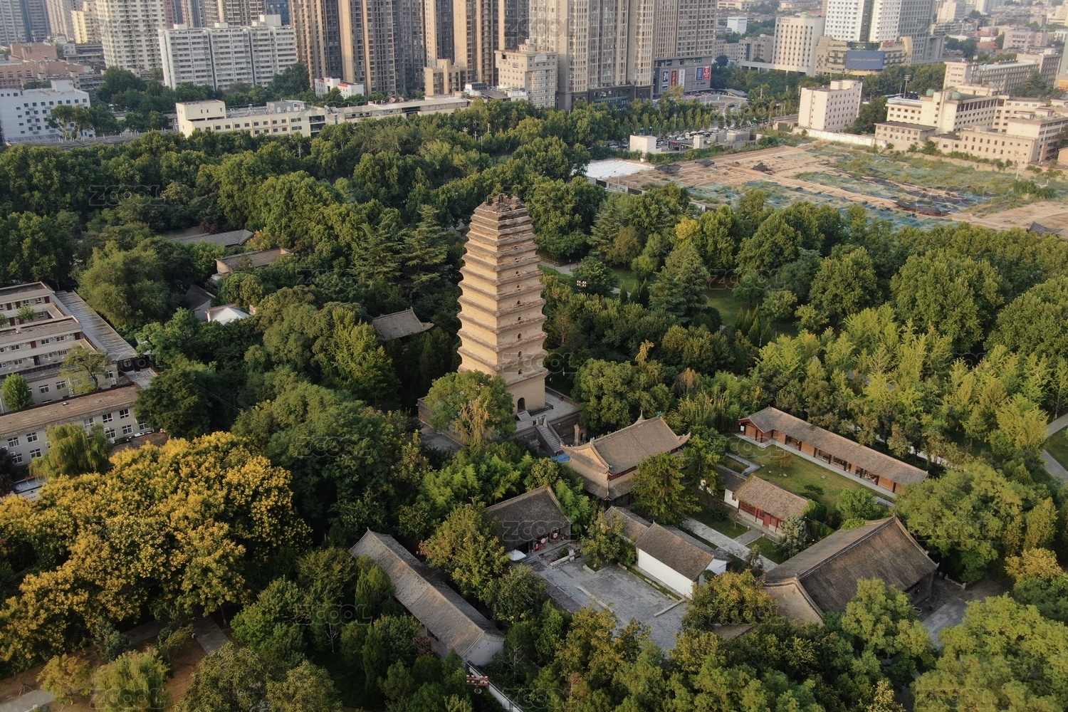 航拍中国西安城市旅游地标建筑景观——小雁塔古建筑