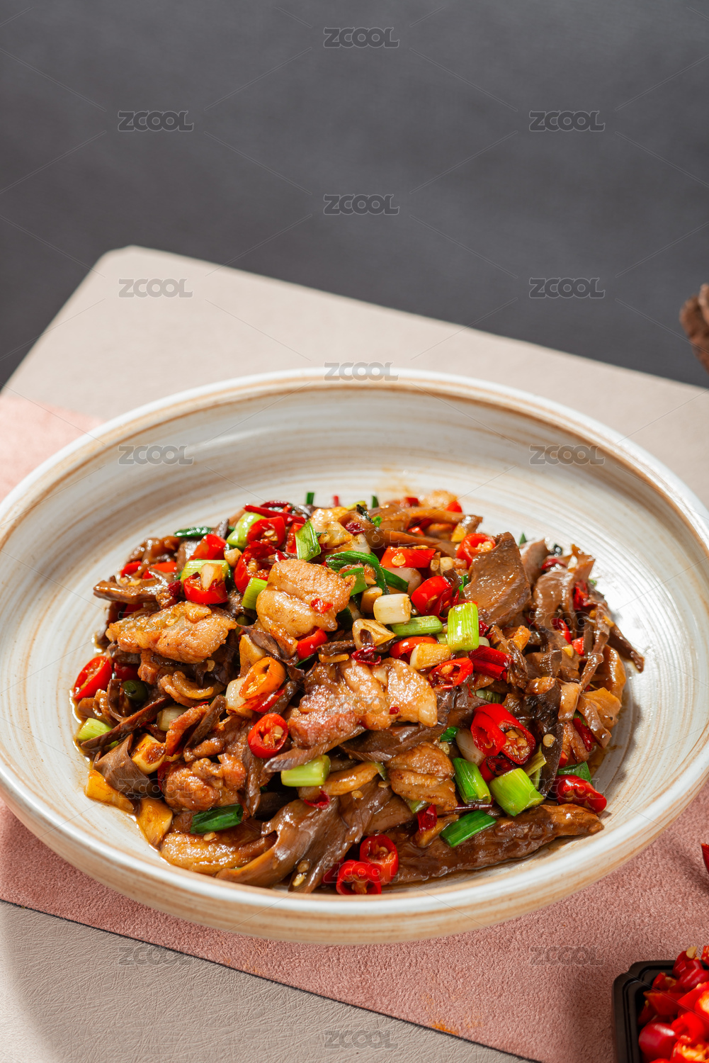 一盆黑色砂锅蒜香跑山鸡摆放在木质砧板上
