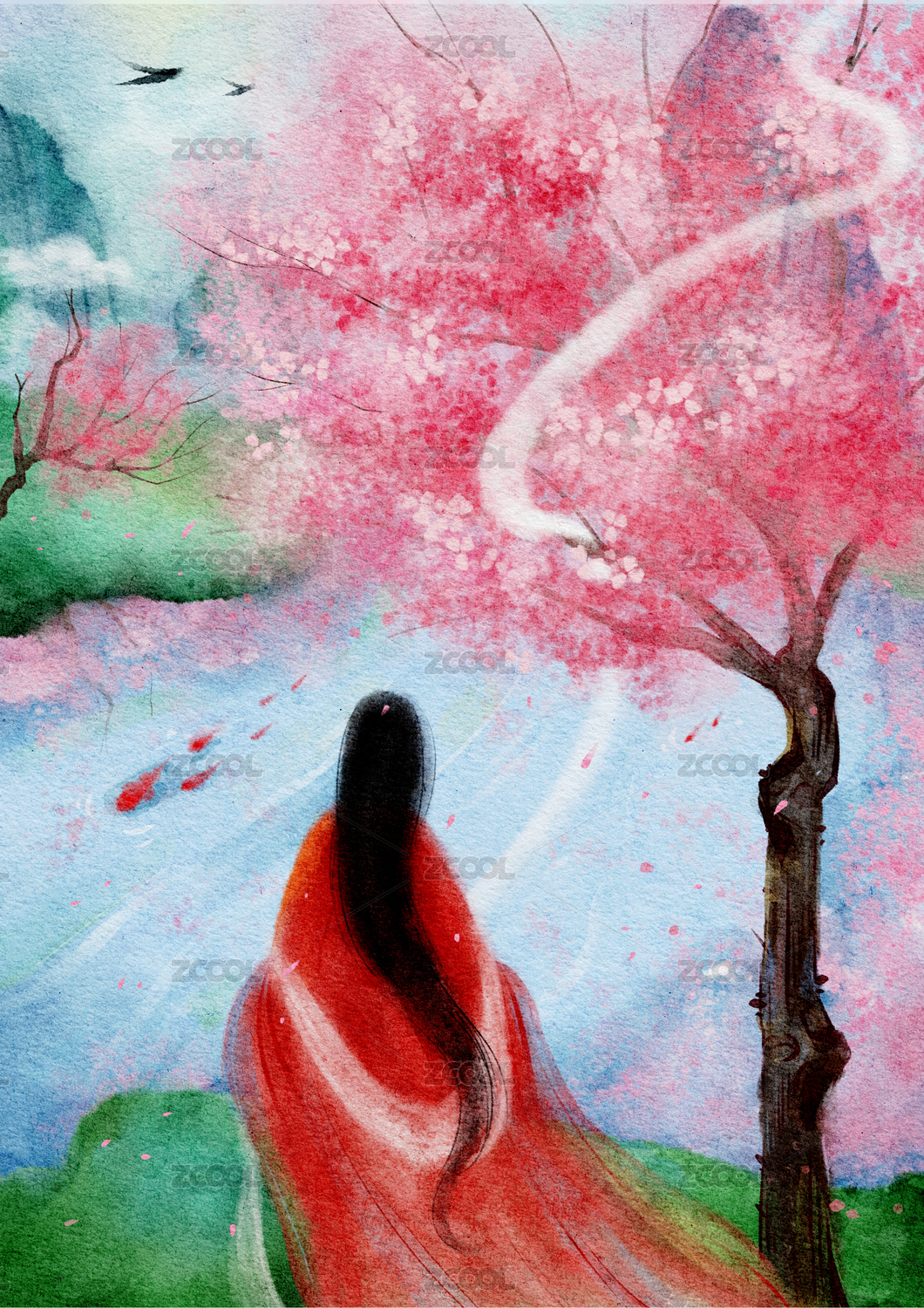 女人花朵户外自然中国风国画水墨画