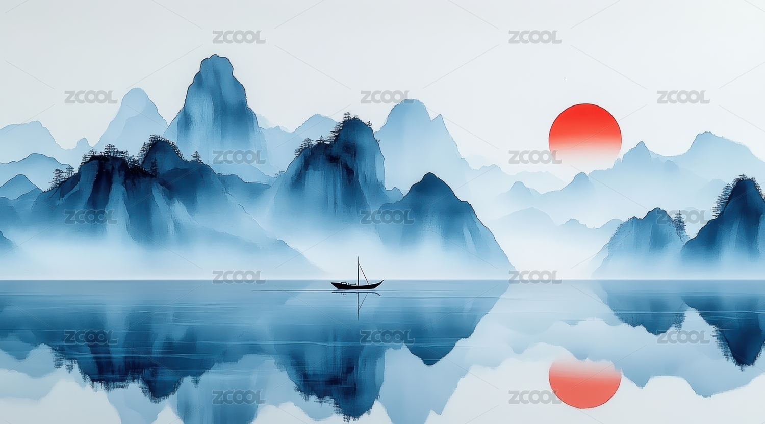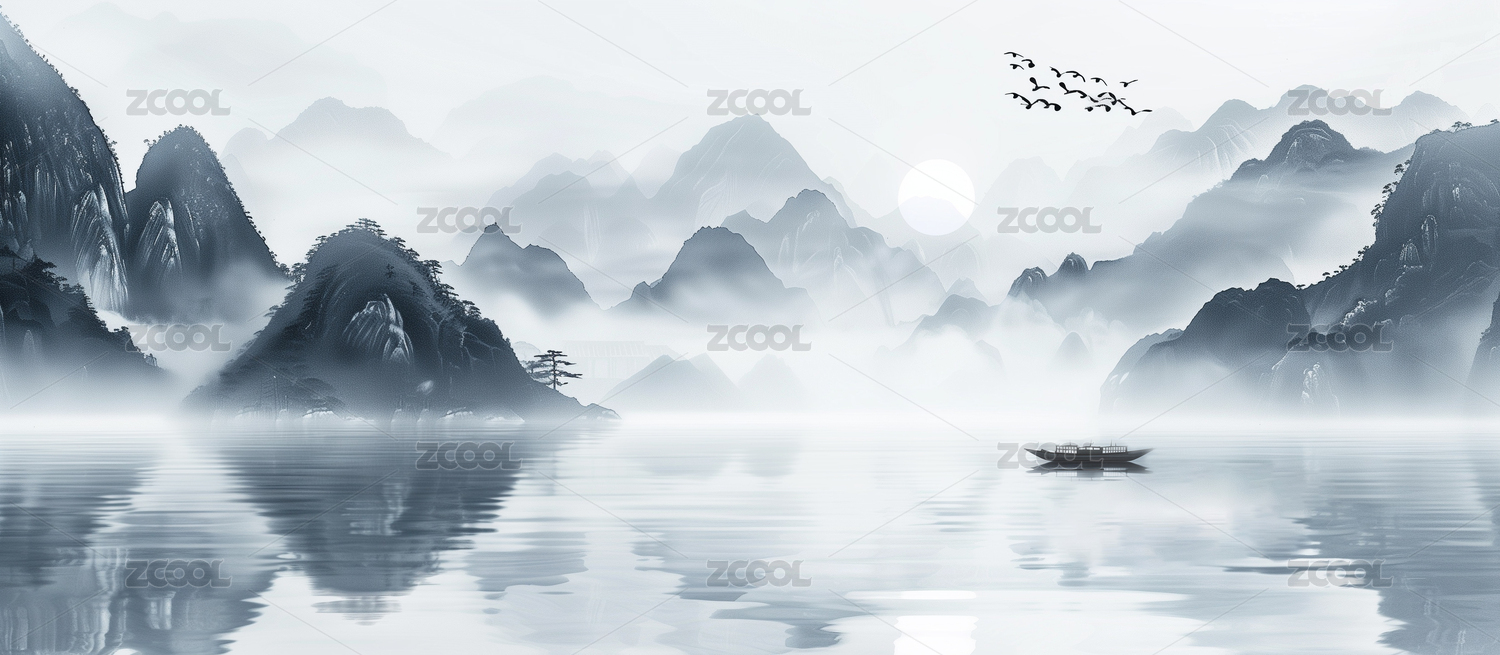 中国风,山水画,水墨画,意境,禅意,古韵,山峰,湖泊,亭台,树木