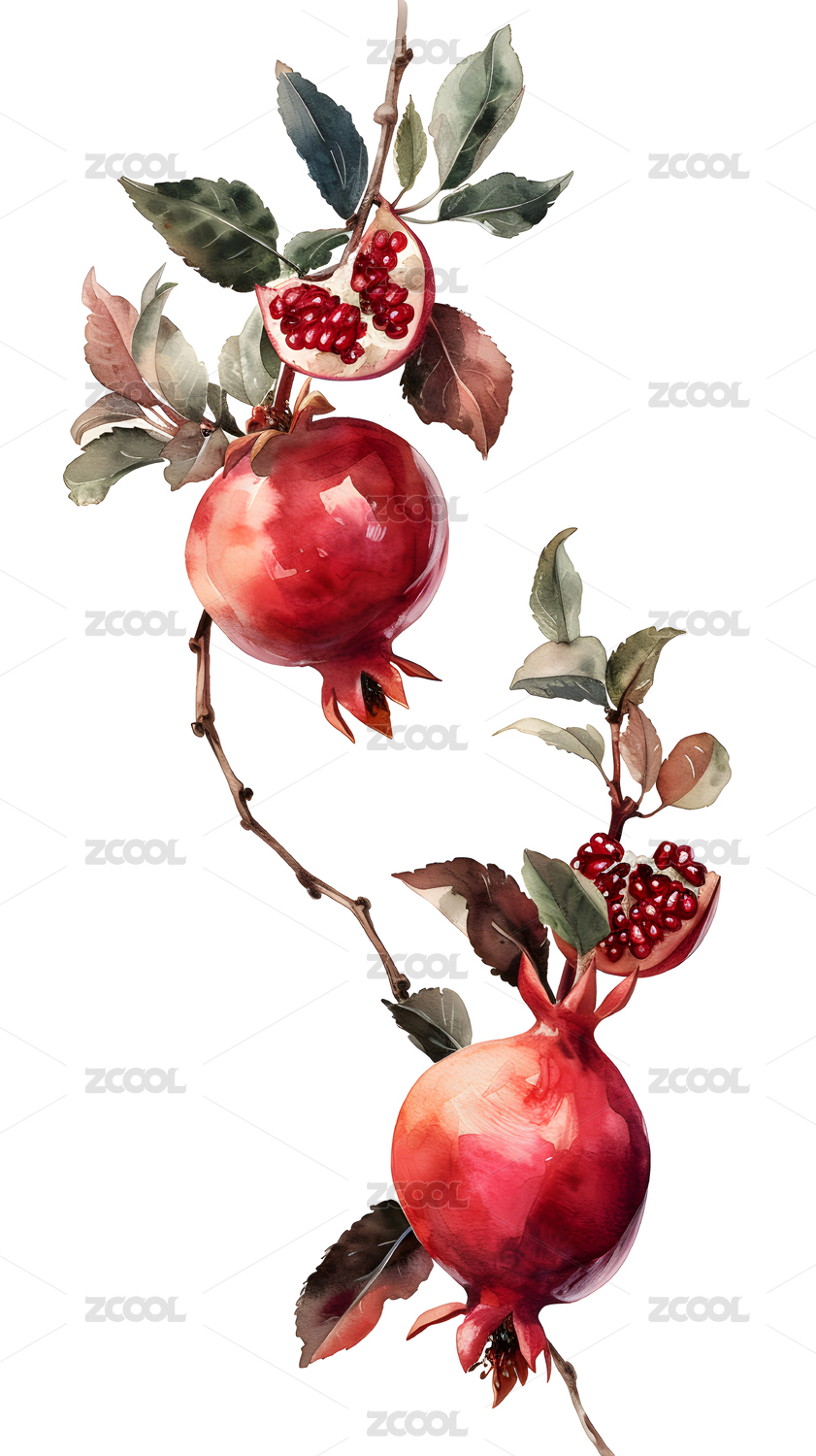 AIGCFG,中国风,水墨,插画,中式风格,国潮风,石榴,水果