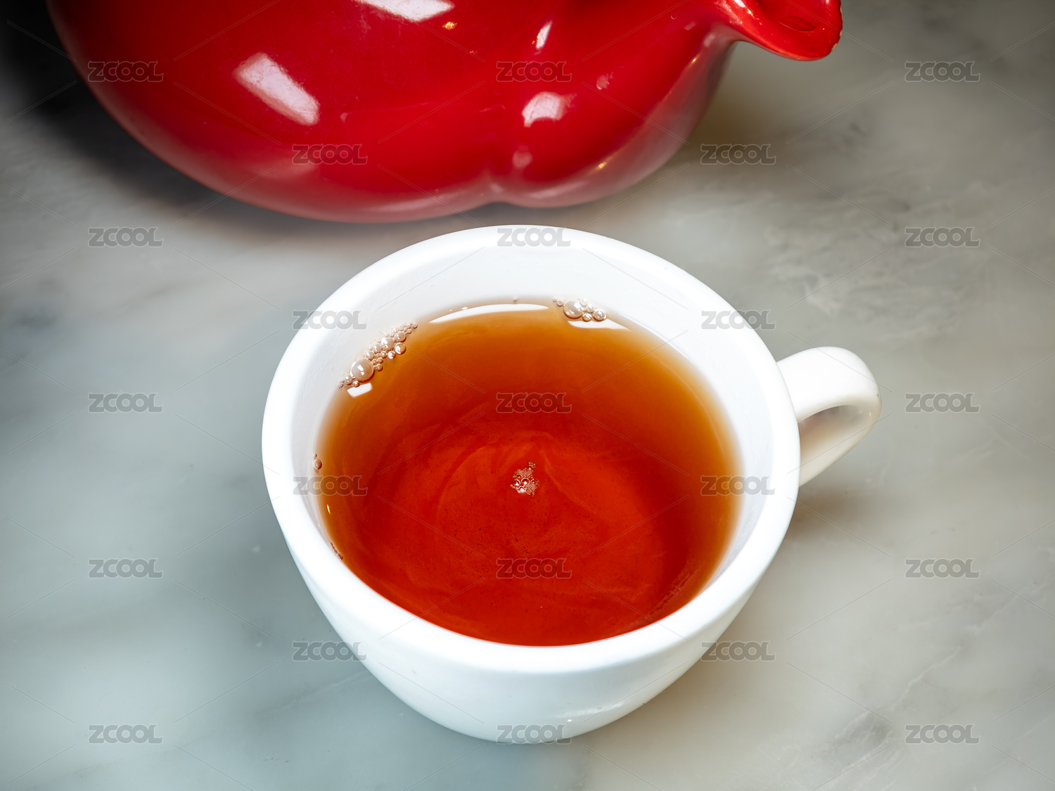 棕色的餐垫上,白色的陶瓷茶杯装满一杯红茶