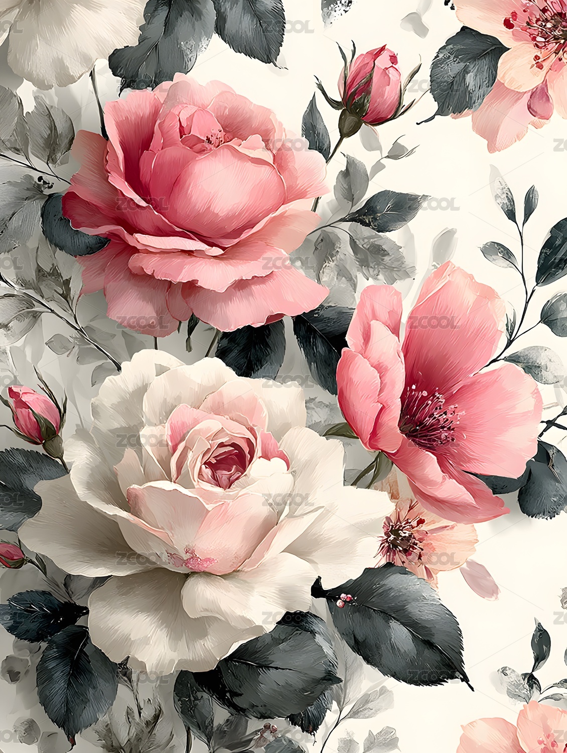粉色牡丹与白色花朵图案