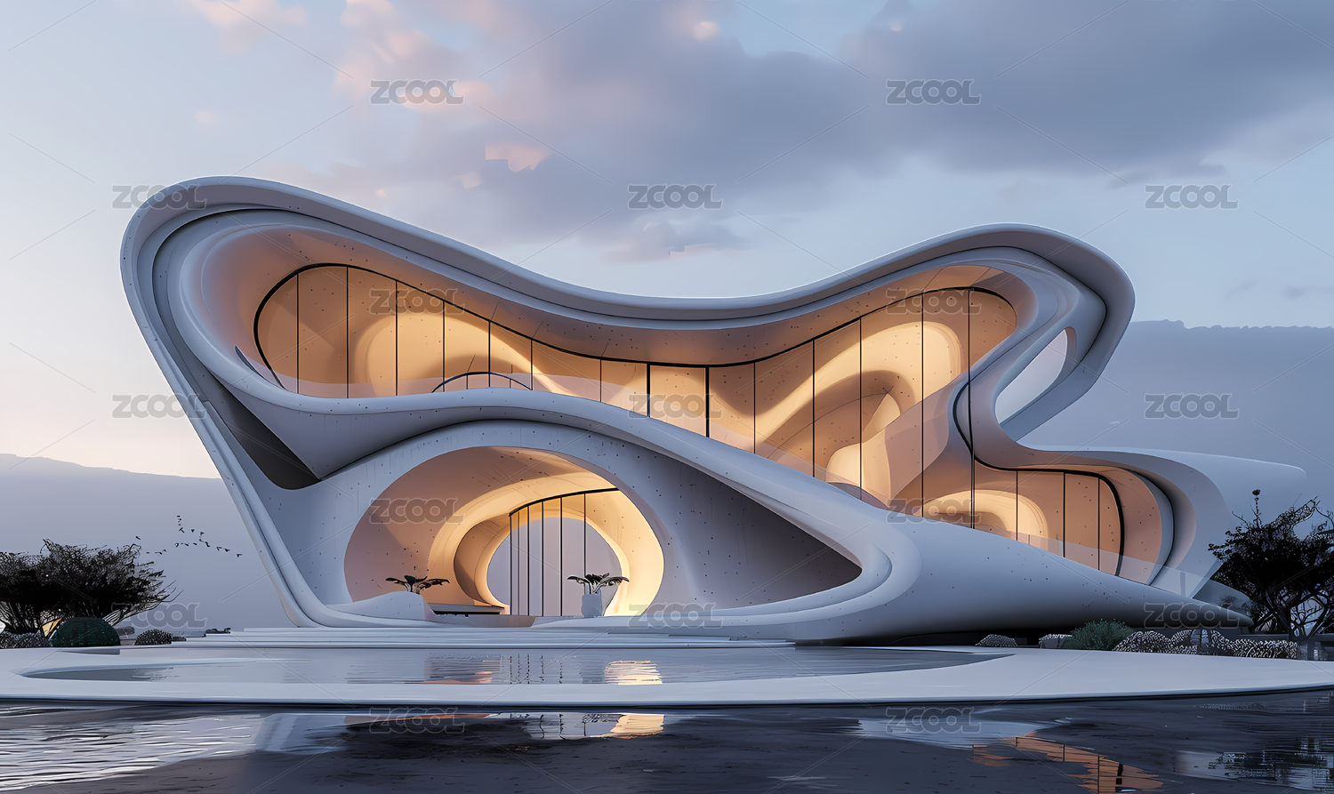 未来主义建筑设计山峦黄昏