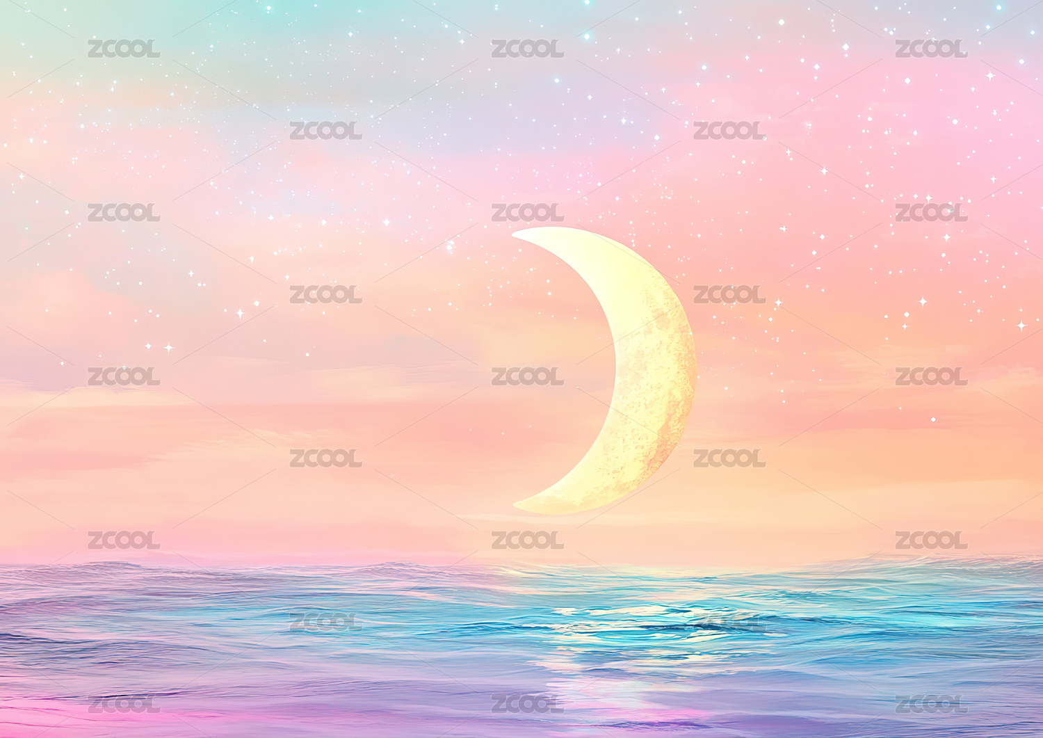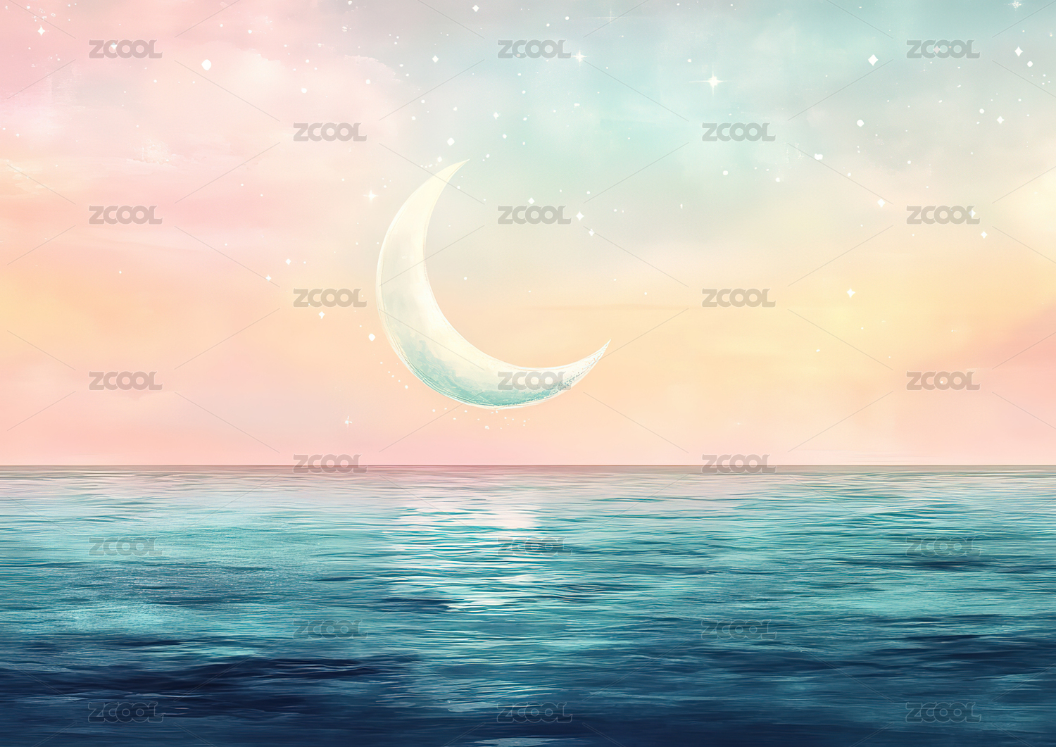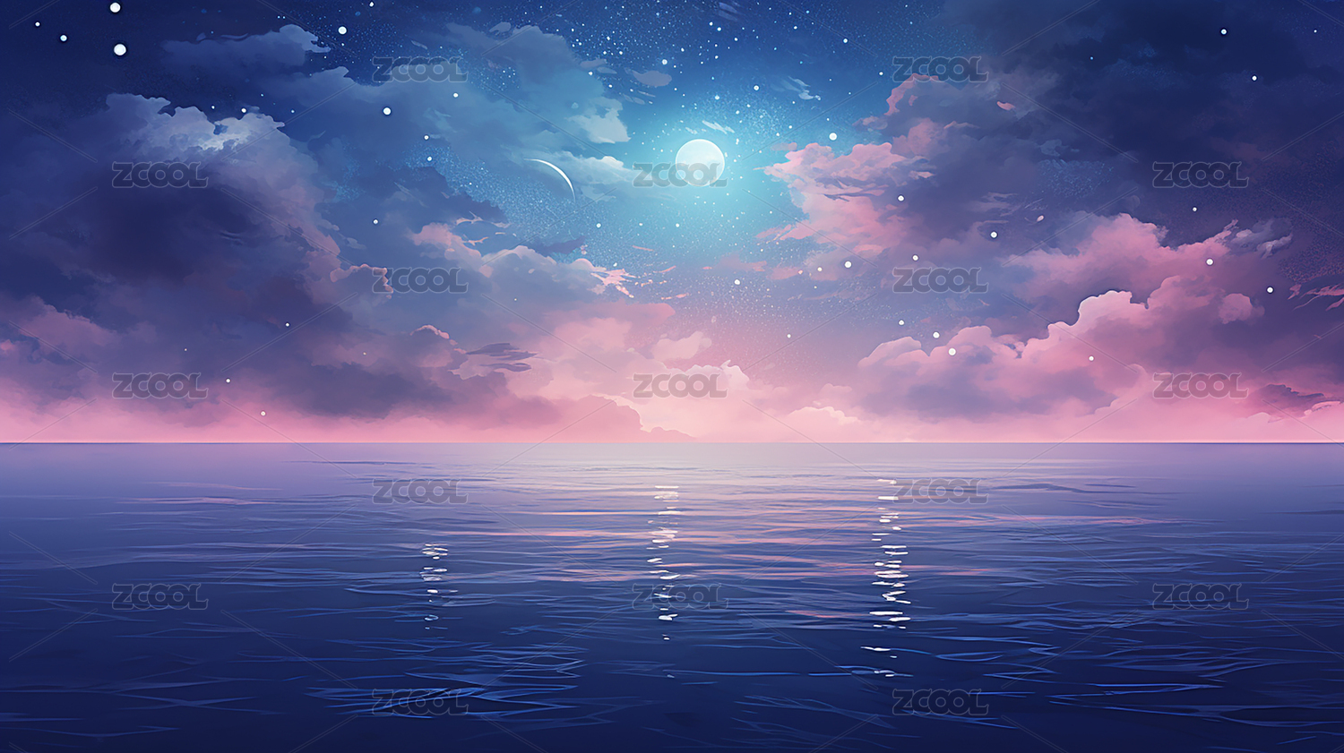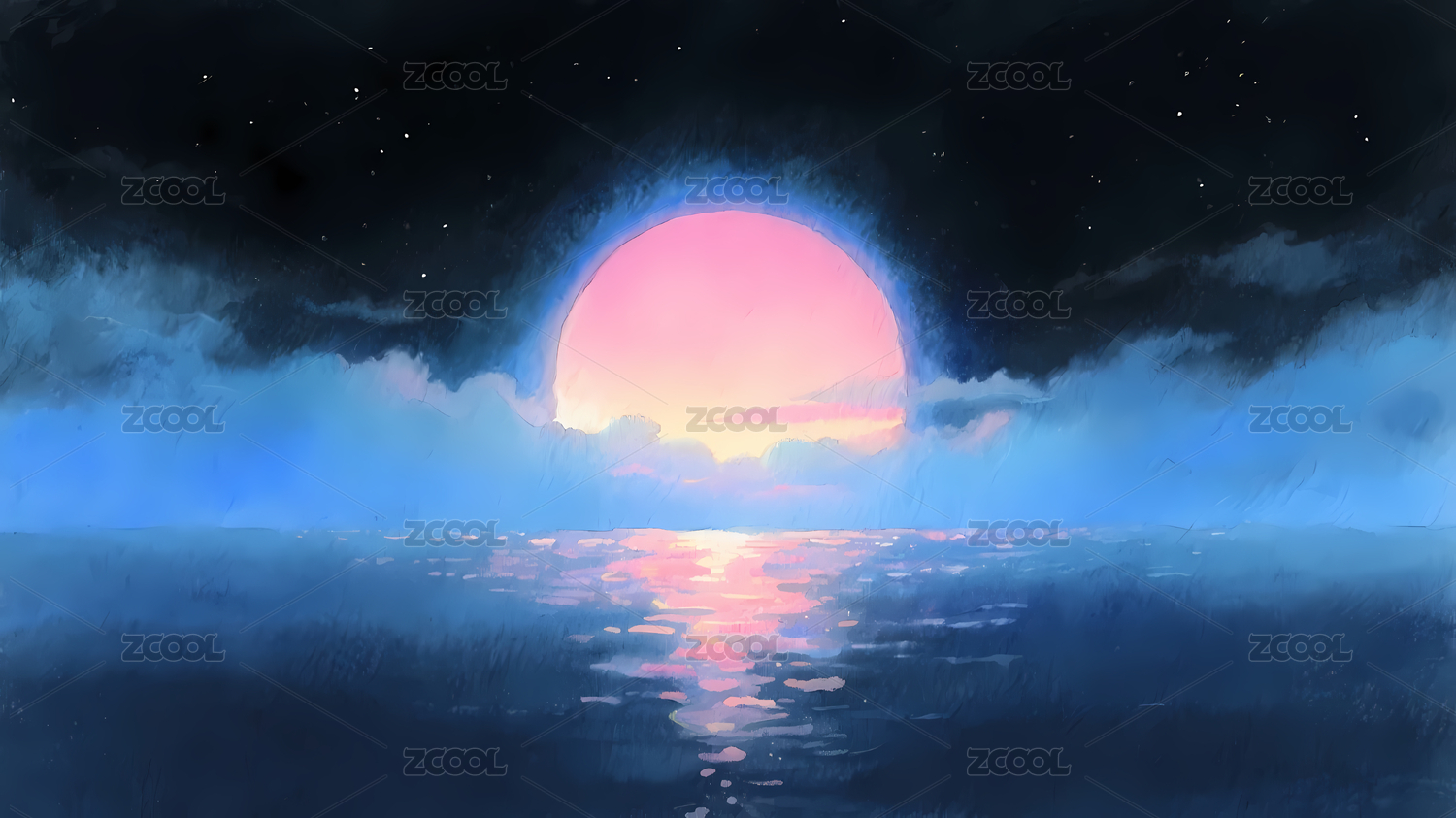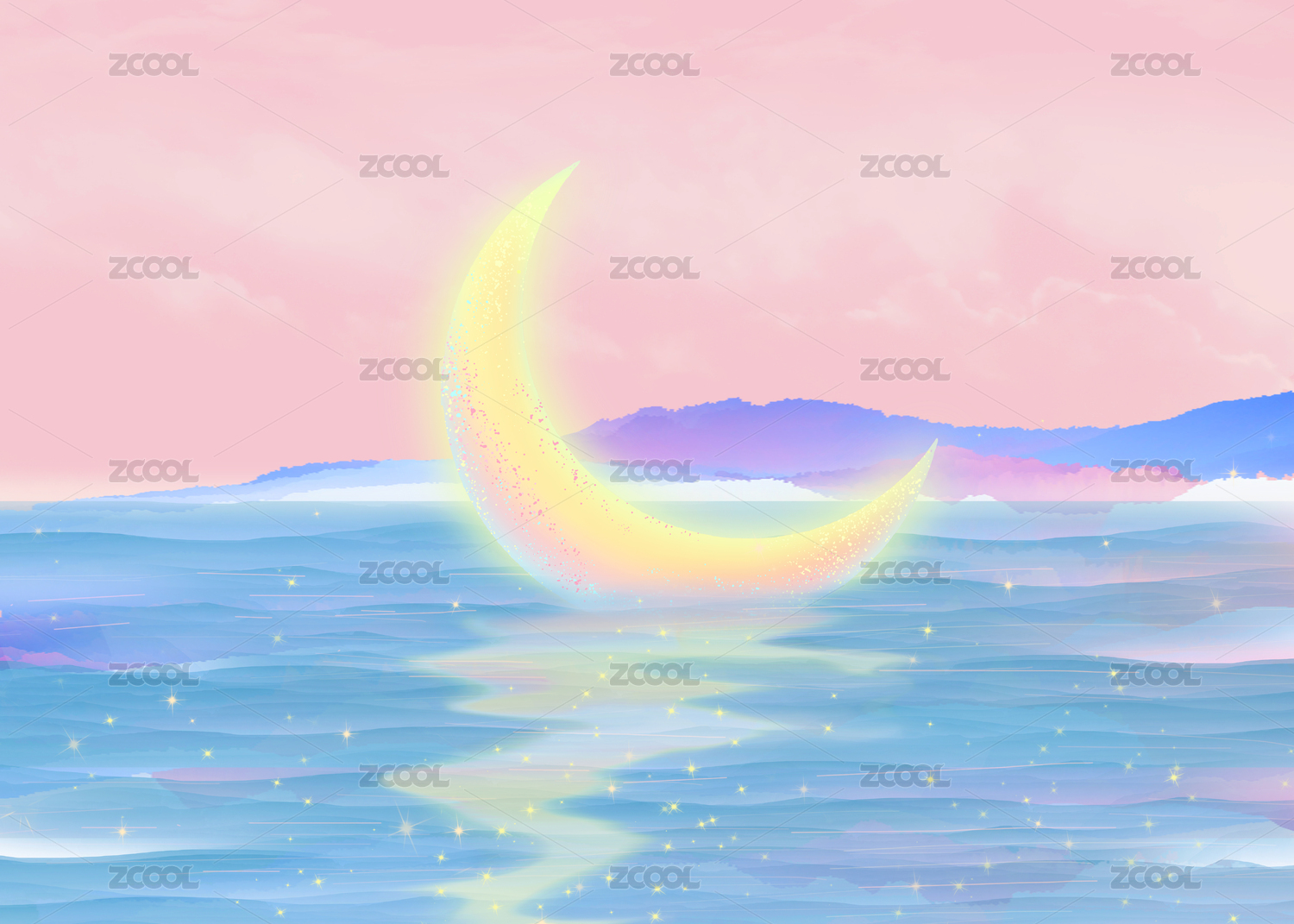 美丽的夜晚,月亮融化在发光的河流里发出淡淡光彩,星光在闪烁抽象插画海报