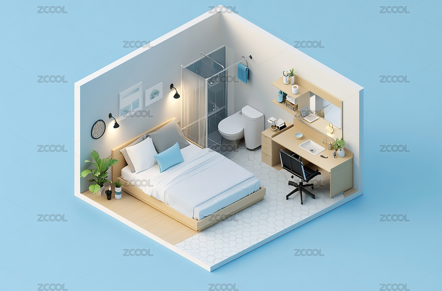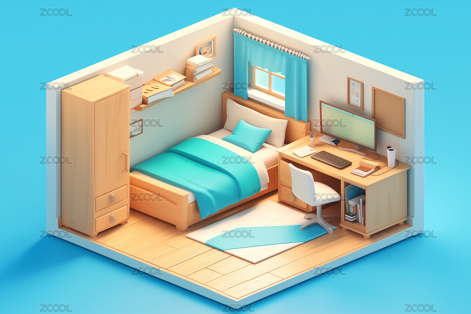 暖色卧室装修俯视立体轴测图3D卡通插画