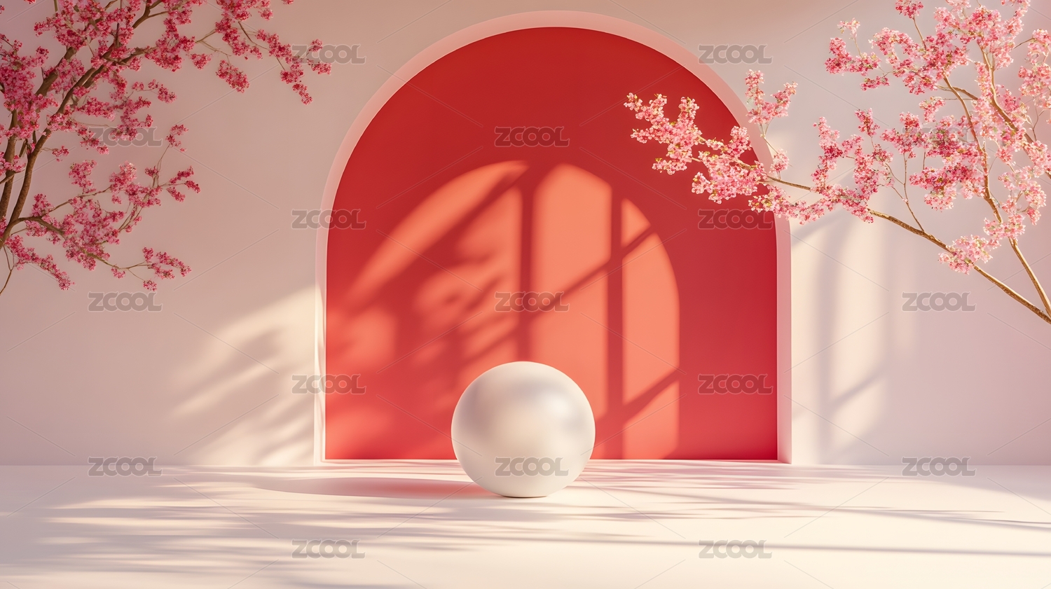 粉色背景下的樱花与展示台