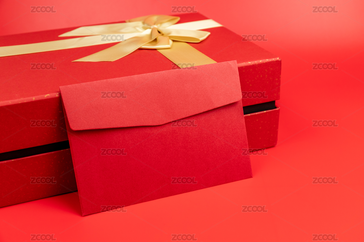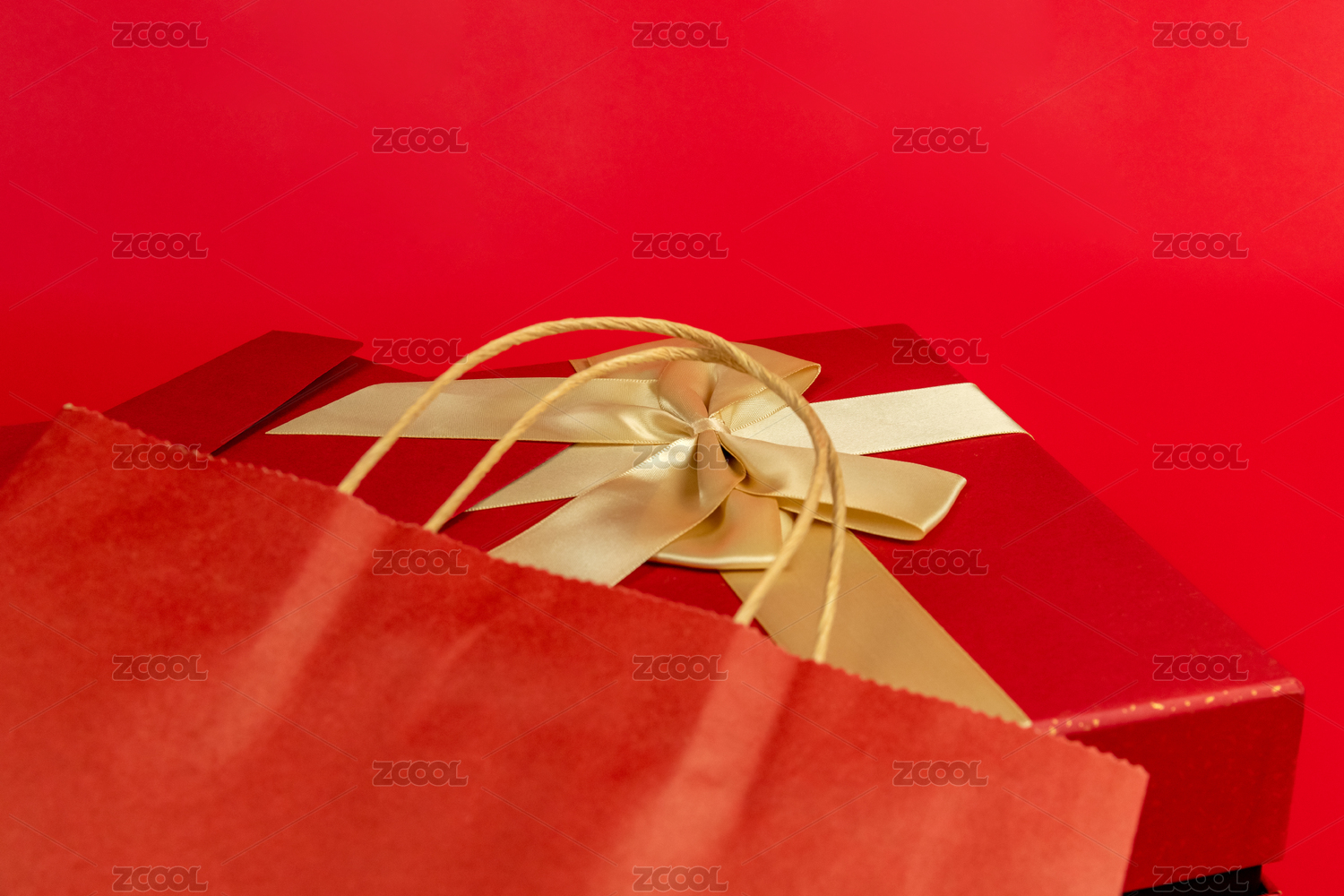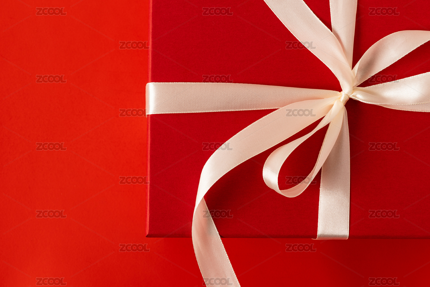 放在红色背景的绑着香槟色带子的红色礼物盒局部