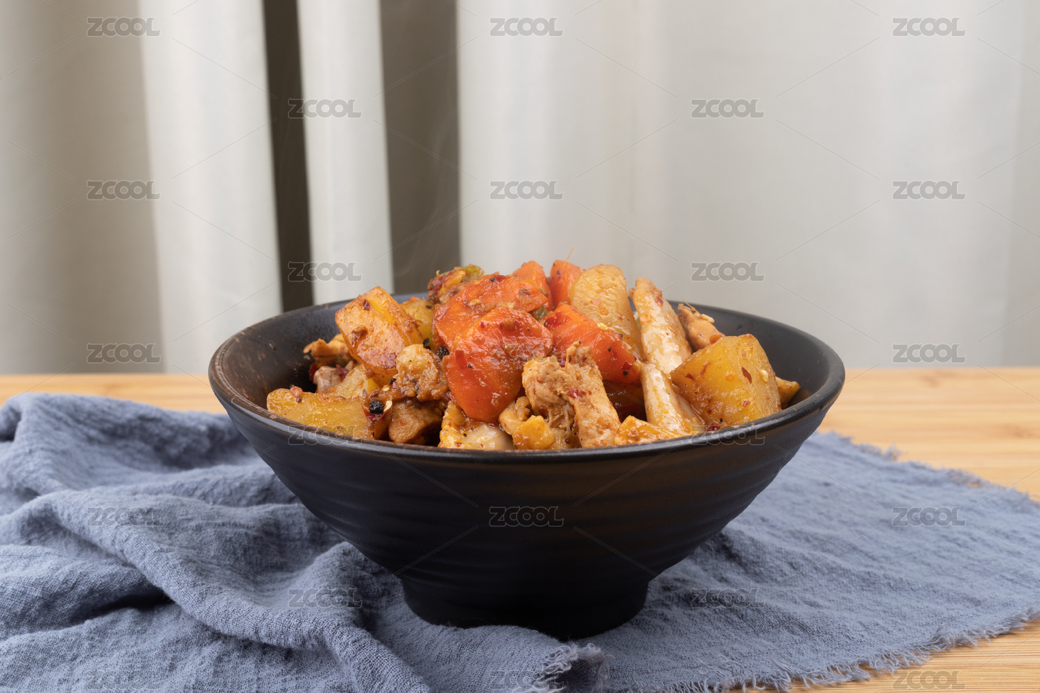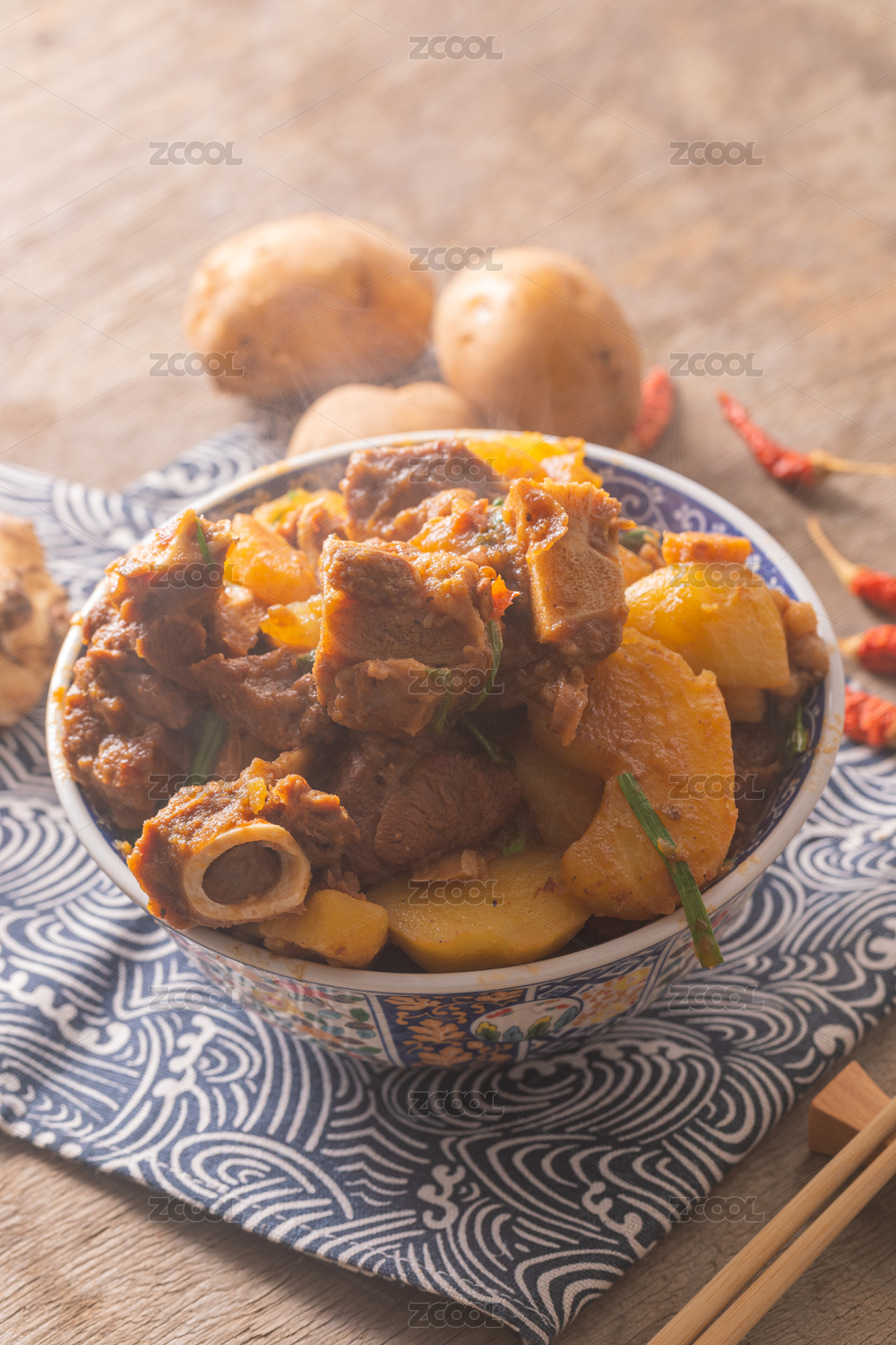 桌子上的一碗土豆炖羊肉