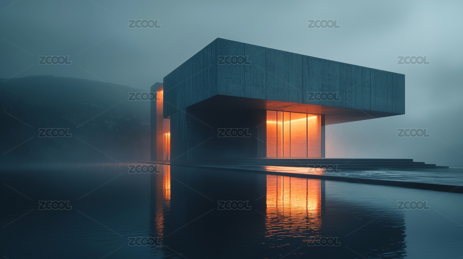建筑,现代,结构,灯光,雾气,树木,草地,反射,湿润,地面