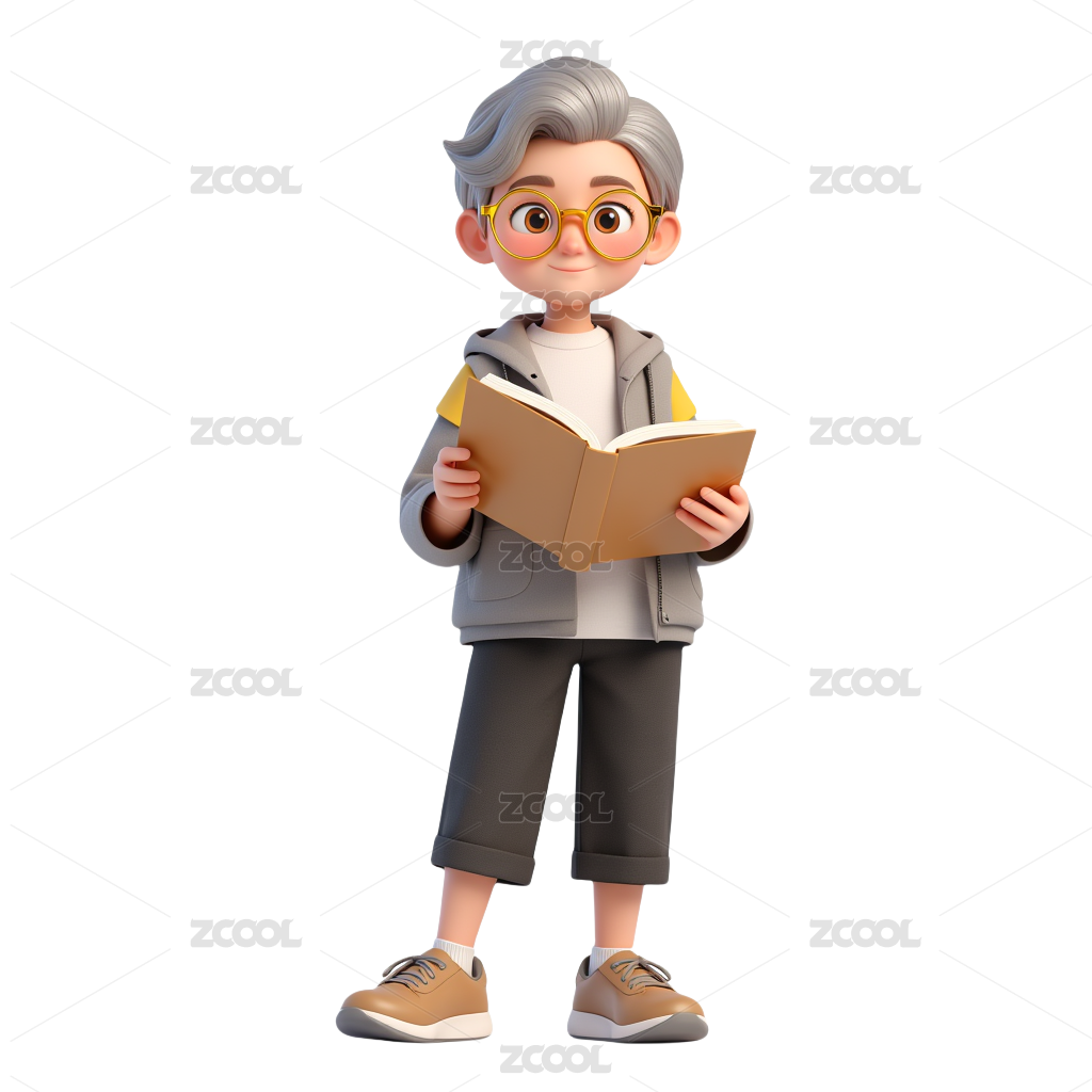 3D可爱黄色毛衣背带戴眼镜手捧书本小男孩