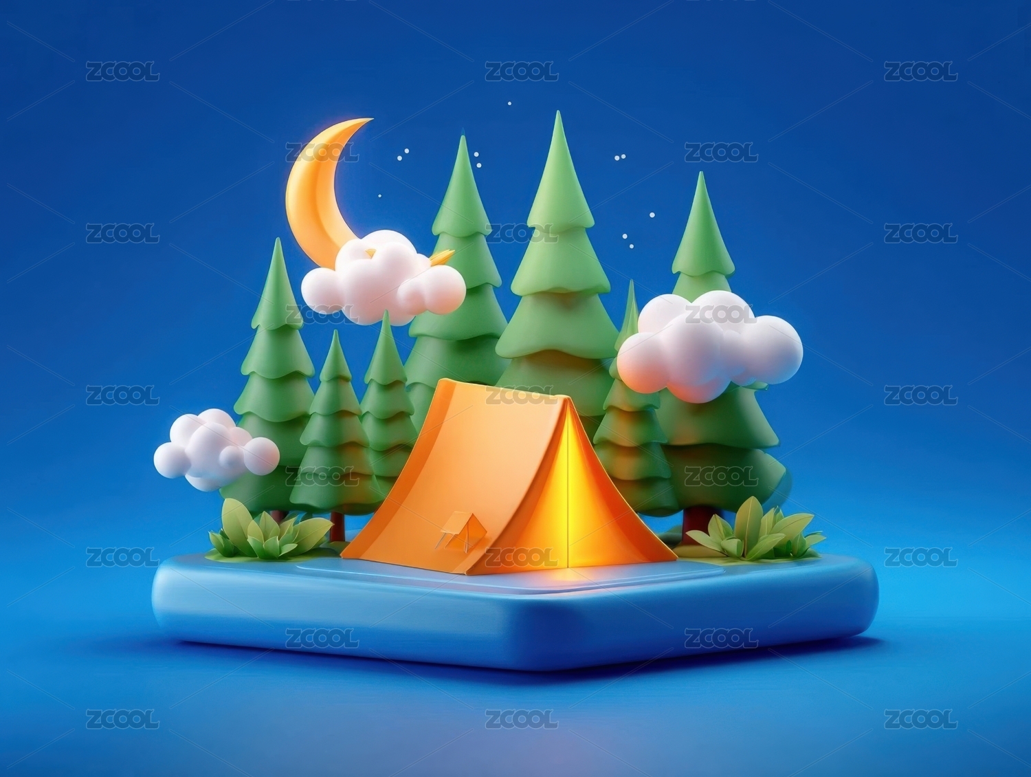 户外夜晚露营假期冒险森林徒步夏令营插画